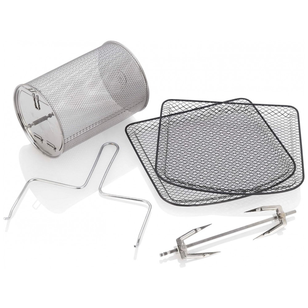 Inclui Forno Air Fryer multifuncional com 1700W de potência, 2 bandejas de cozimento antiaderentes, bandeja coletora antiaderente, cesto rotativo em aço inoxidável, espeto, garfos e ferramenta de remoção, eBook de receitas e manual multilíngue com instruções de uso.