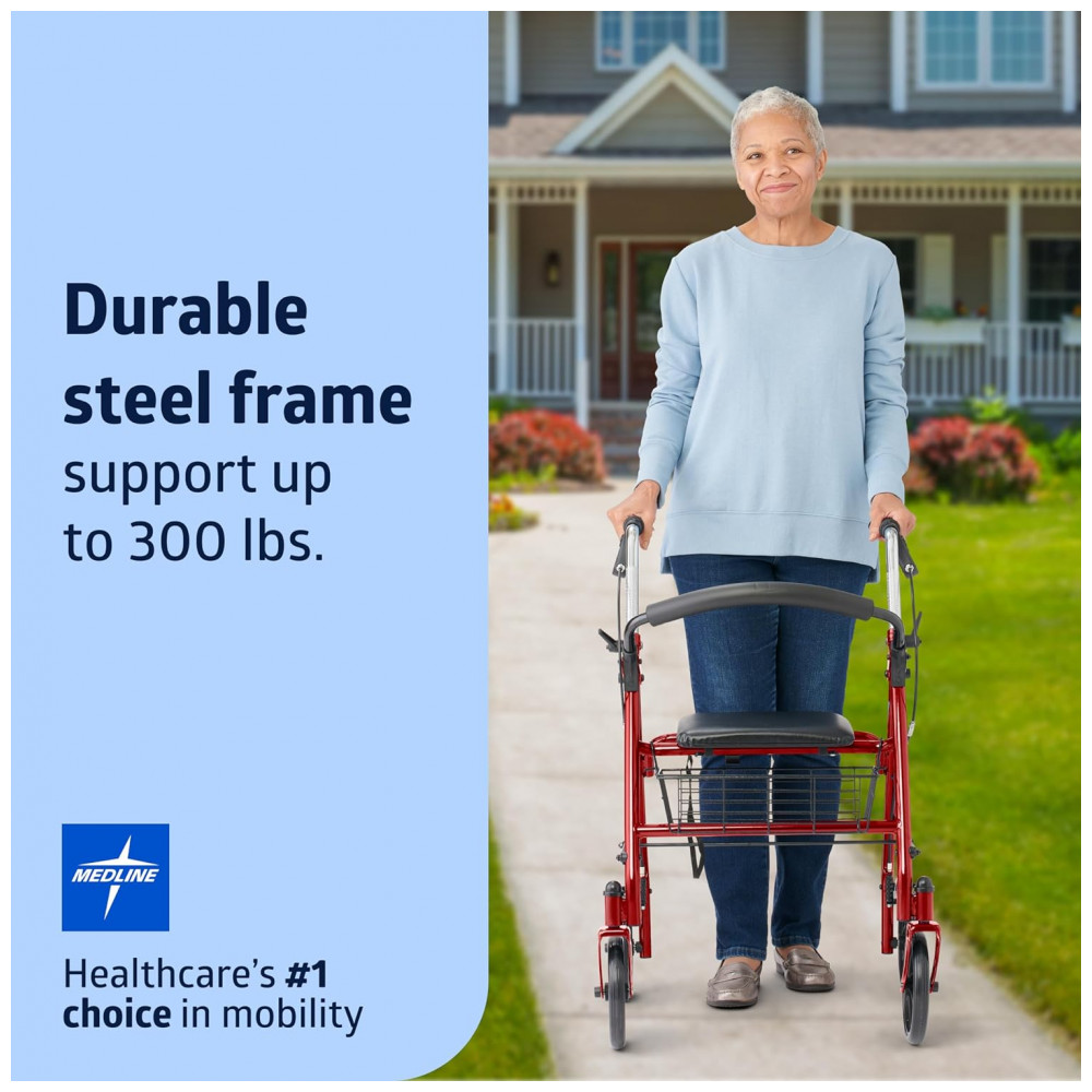 Andador Adulto Idoso com Apoio de Braço, Assento Acolchoado e Cesto, Suporta até 136 kg, MEDLINE MDS86860ERS8, Vermelho: Este andador de rolamento Medline é feito de aço forte e durável e sua estrutura reforçada suporta usuários com peso de até 136 kg.