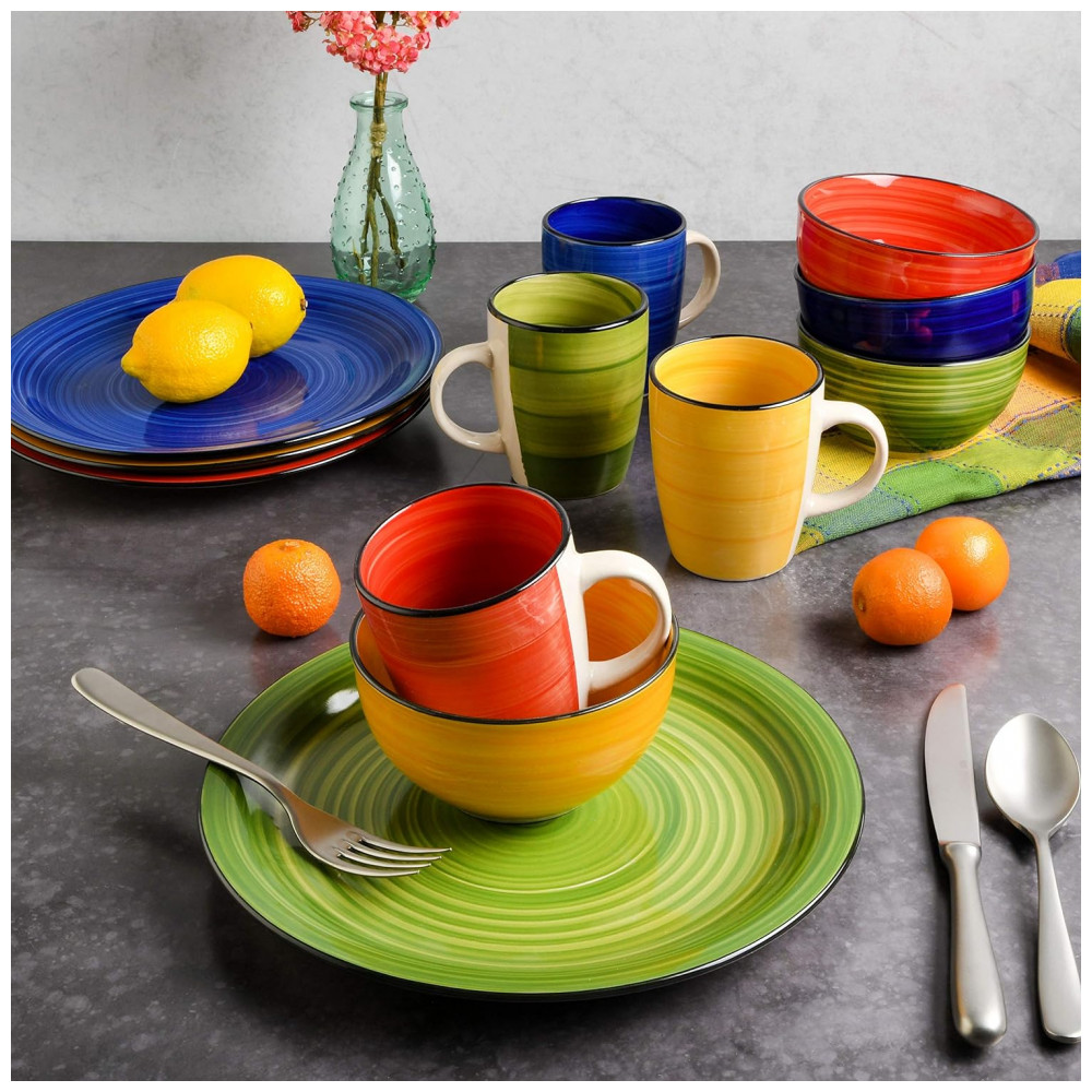 Aparelho de Jantar com 12 Peças em Cerâmicas, Cores Variadas, Gibson Home Vibes: Divertidos talheres mistos pintados à mão.