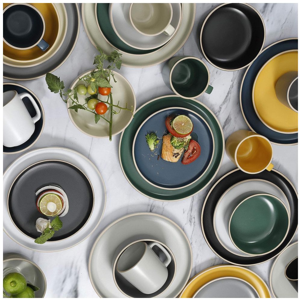 PROJETO ESTILIZADO inspirado nas animadas praias de Los Angeles, o conjunto de louça Zuma foi projetado com um esmalte suave e fosco em grés, com um lábio esbranquiçado ao longo da borda.