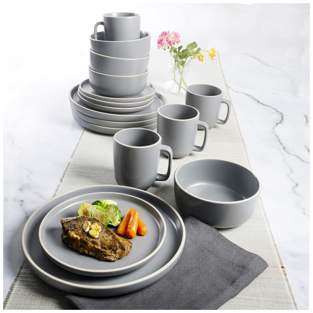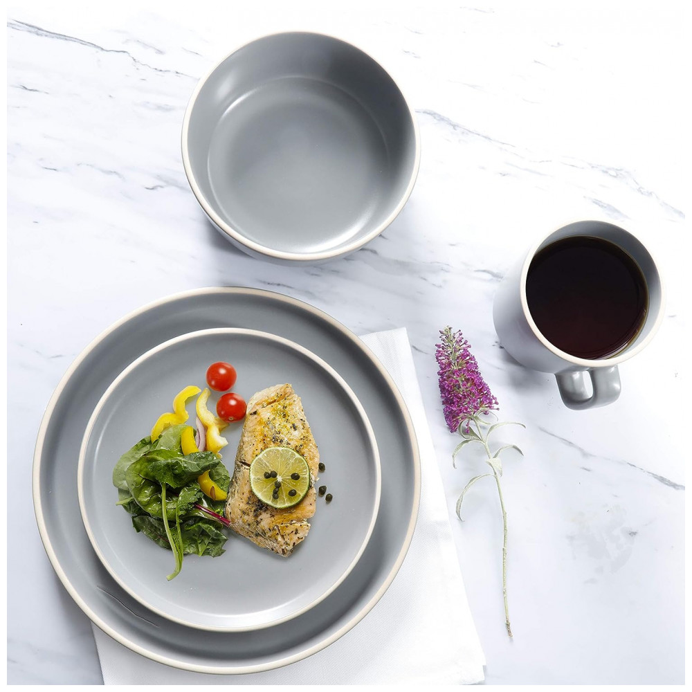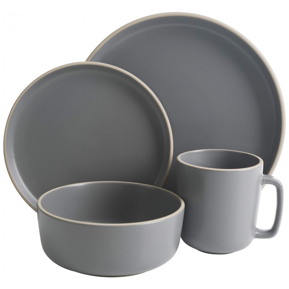 Aparelho de Jantar com 16 Peças em Cerâmica Faiança Incluindo Pratos, Xícaras e Bowls, Gibson Home Zuma, Cinza