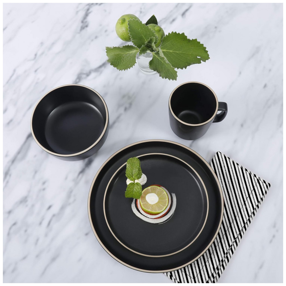 Aparelho de Jantar com 16 Peças em Cerâmica Faiança Incluindo Pratos, Xícaras e Bowls, Gibson Home Zuma, Preto