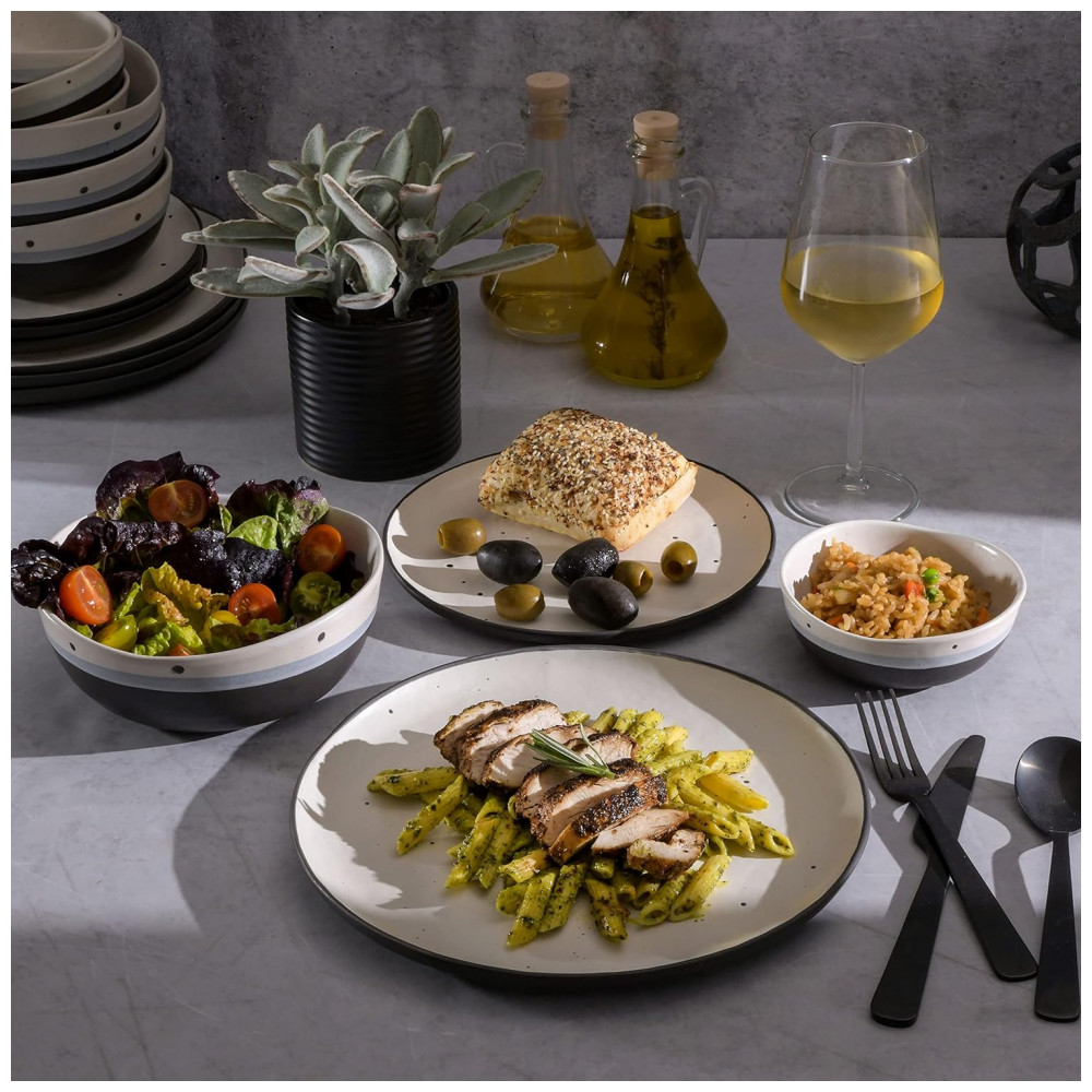 Aparelho de Jantar com 16 Peças em Cerâmica Gibson Elite Rhinebeck, Preto e Branco: O QUE ESTÁ NA CAIXA Serviço para 4 pessoas que inclui 4 de cada um dos seguintes Pratos para jantar de 25 centímetros, Pratos para sobremesas de 20 centímetros, Tigelas artesanais de 828 mL e Tigelas de frutas 266 mL INSTRUÇÕES DE CUIDADO pratos bonitos que também são lavadores de pratos e cofre de microondas LUZE DE ALMOÇO , REATIVO reativo refere se a uma técnica de como várias cores dentro do esmalte reagem juntas para criar uma qualidade vibrante e onírica às cores e tons.