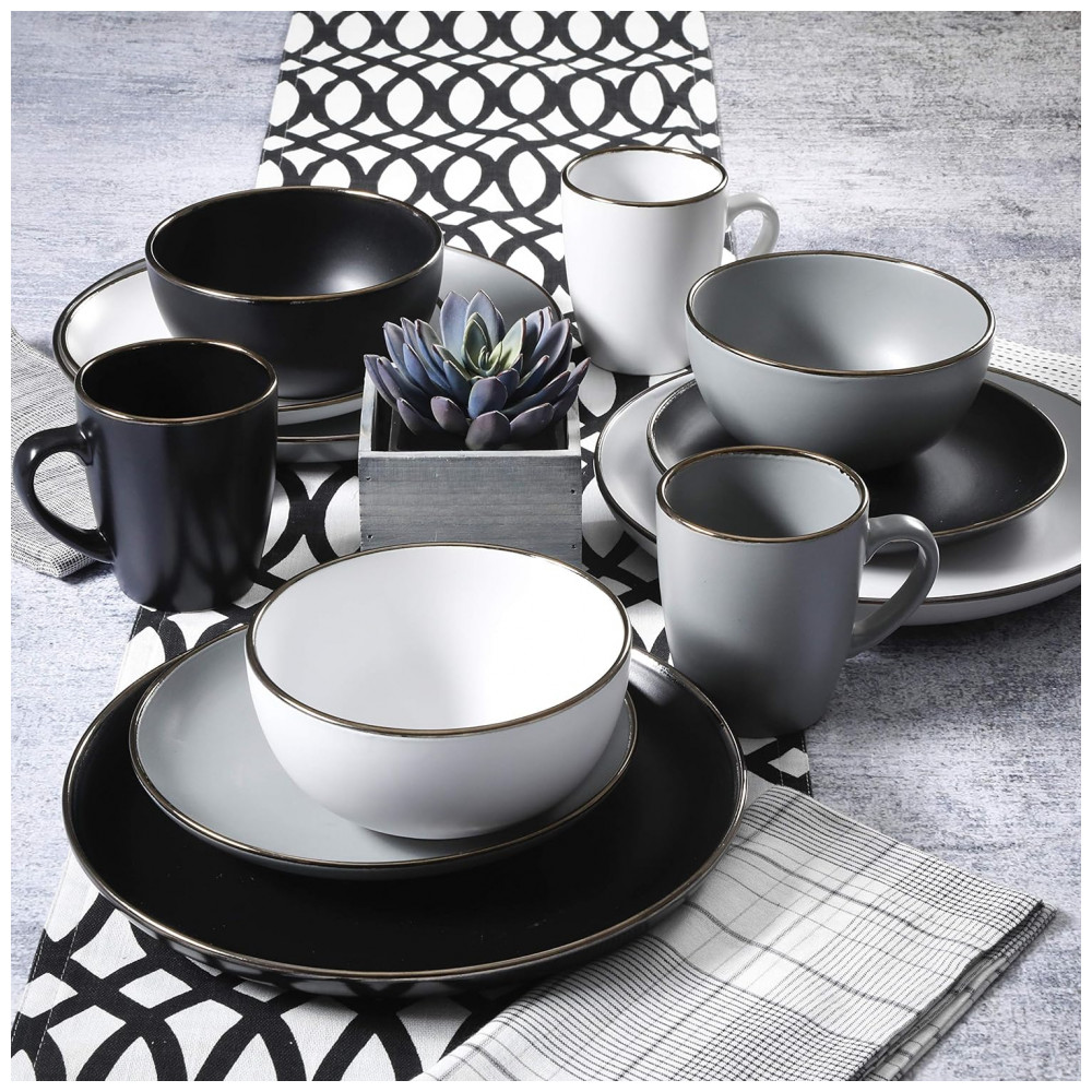 Aparelho de Jantar com 16 Peças em Porcelana, Borda Preta, Gibson Home Oslo, Branco