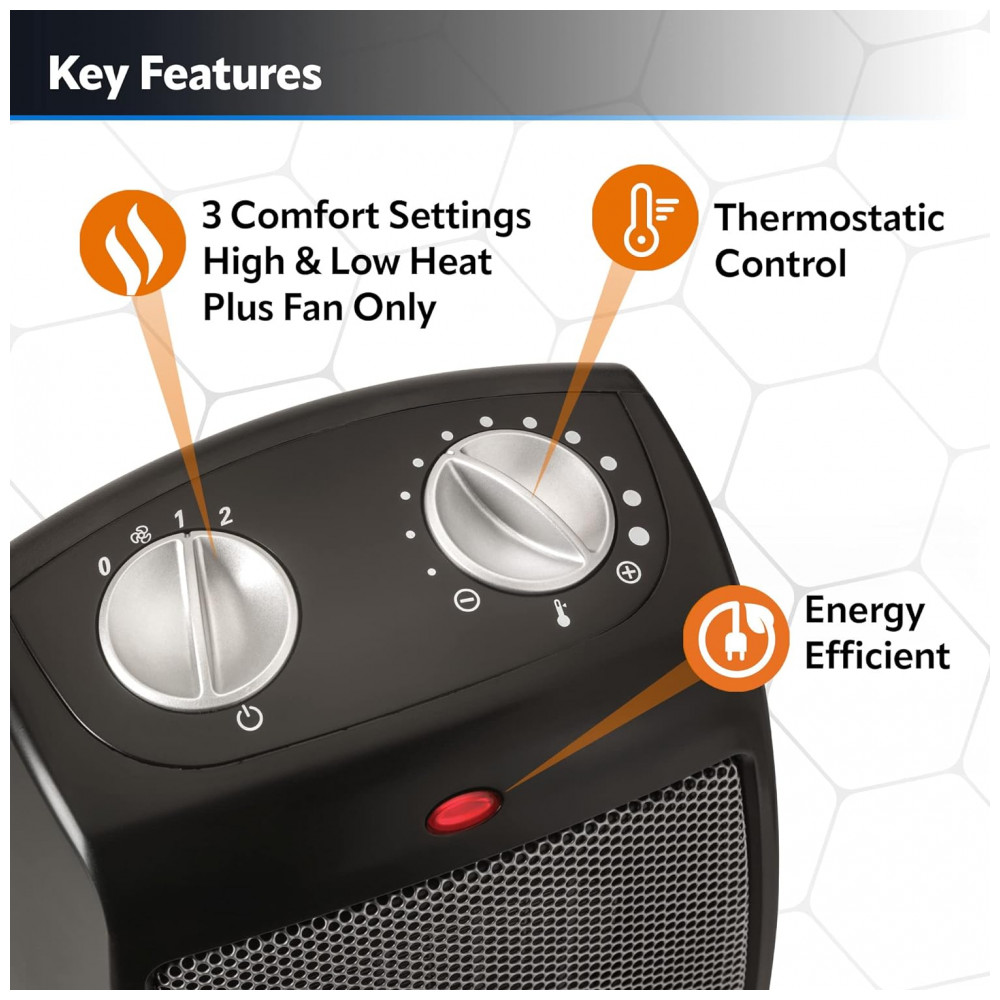 Apresentando o Aquecedor Lasko CD09250 de Mesa ou Sob a Mesa com Termostato Ajustável de Cerâmica, 22,86 cm de Altura, Preto 3 CONFIGURAÇÕES SILENCIOSAS Incluindo alto calor, baixo calor e apenas ventilação, este aquecedor elétrico é ideal para aquecer uma área em sua casa ou escritório doméstico.