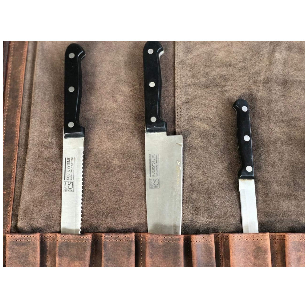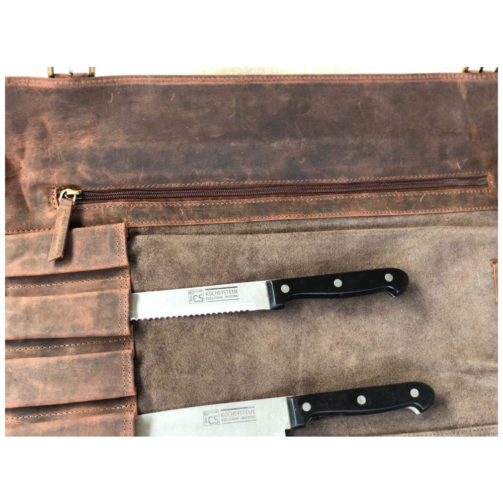 SEGURANÇA E SEGURANÇA Bolsos elásticos e extensíveis para facas para zenar e proteger suas facas com firmeza e um bolso com zíper em uma extremidade para seus acessórios Nosso couro de alta qualidade protegerá as facas de amassados, arranhões ou umidade quando não estiverem em uso Uma maneira elegante de zenar e transportar suas facas com segurança.