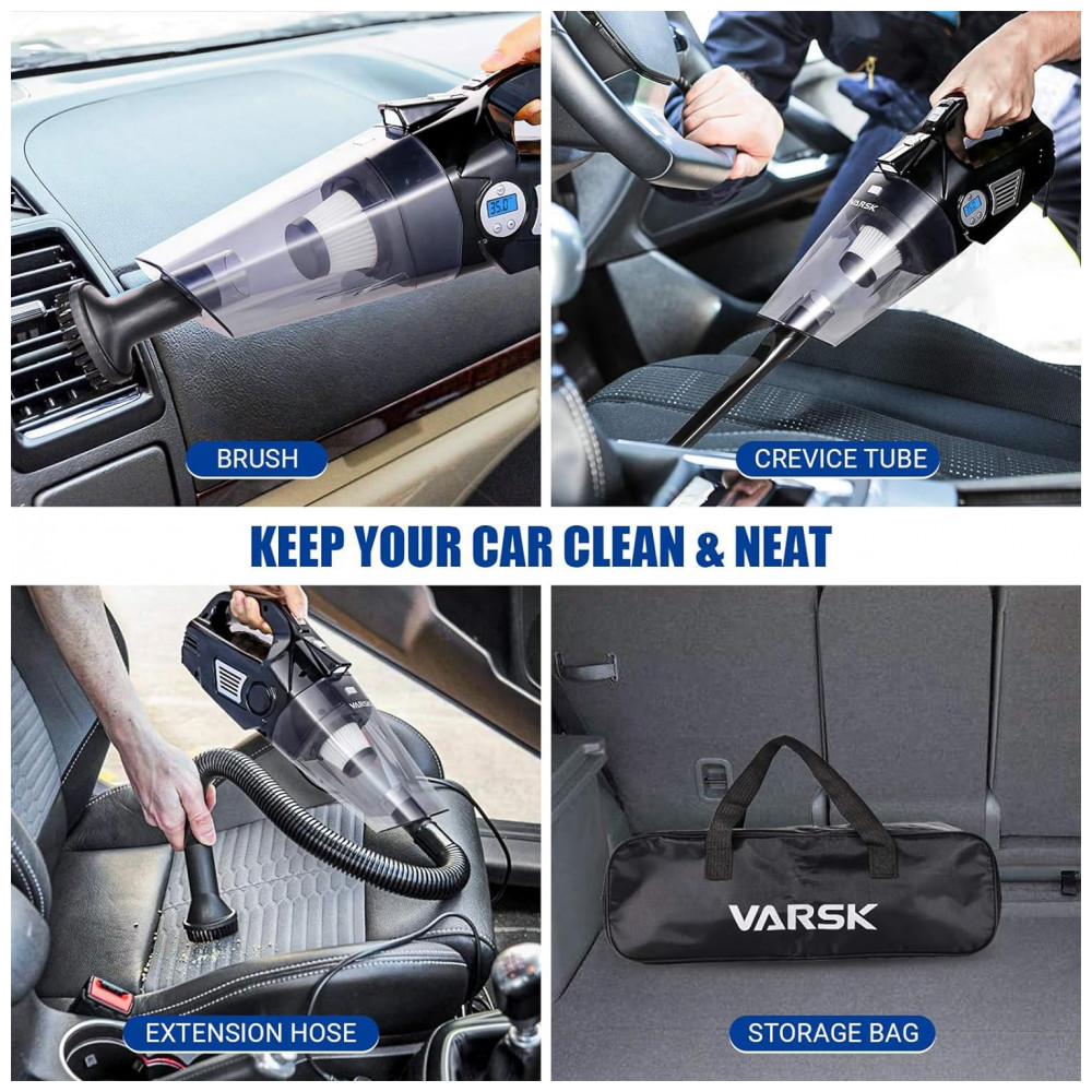 Aspirador de Pó Automotivo Portátil 4 em 1 Compressor de Ar Luz LED LCD 12V, VARSK, Preto