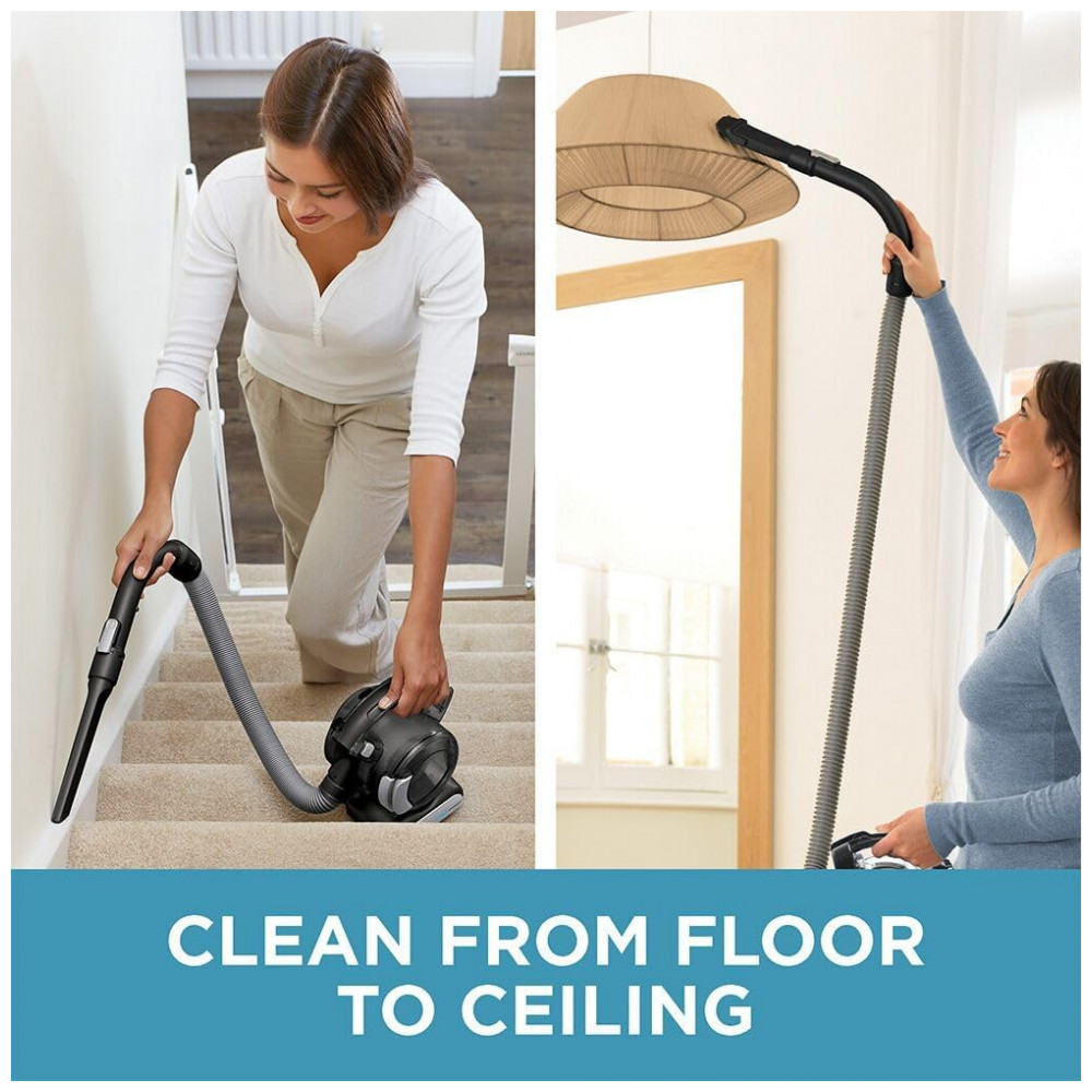 Limpe do chão ao teto com facilidade, graças à mangueira flexível de 4 pés que permite alcançar áreas altas e de difícil acesso.