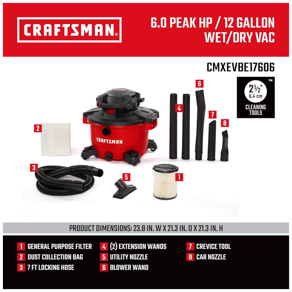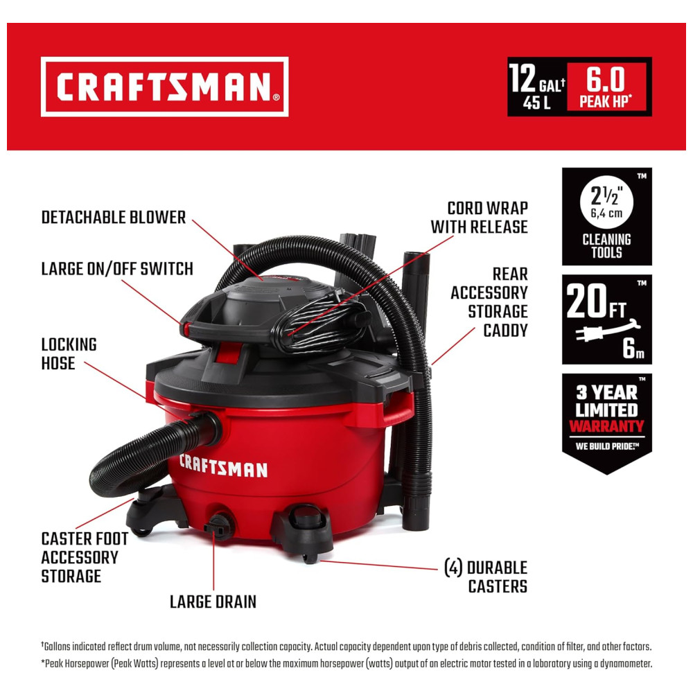 Aspirador de Pó Seco e Úmido 45L, 6CV de potência com Soprador de Folhas, 110v, CRAFTSMAN CMXEVBE17606, Vermelho: