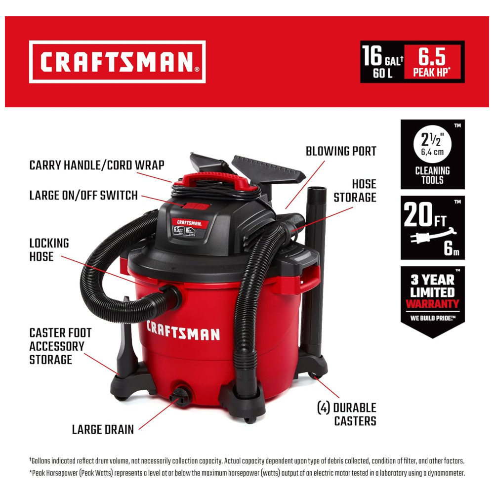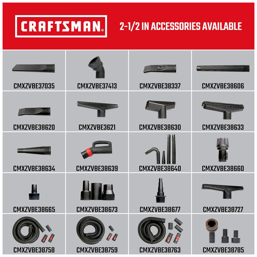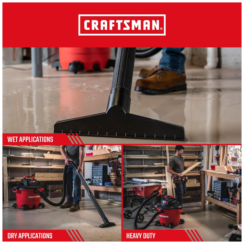 Descubra o Poder do Aspirador CRAFTSMAN CMXEVBE17595 Eficiência Incomparável em Limpeza Pesada Robustez Extrema Equipado com um motor de 6,5CV de potência máxima, o aspirador CRAFTSMAN CMXEVBE17595 é o aliado perfeito para grandes projetos em garagens, oficinas e locais de trabalho.