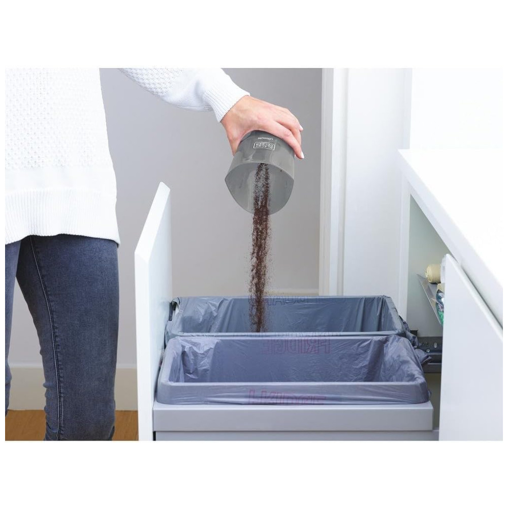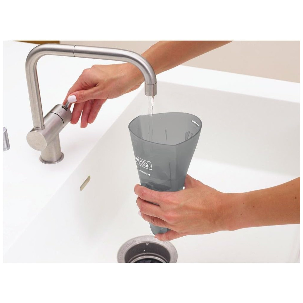 O recipiente de sujeira translúcido e sem saco facilita a visualização do nível de sujeira e é fácil de esvaziar.