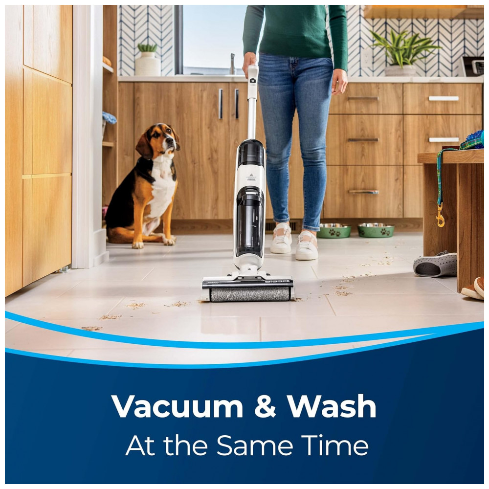 ASPIRE E LAVE AO MESMO TEMPO Economize tempo e esforço ao aspirar e lavar várias superfícies de pisos duros selados com uma única máquina, em um único passo simples.