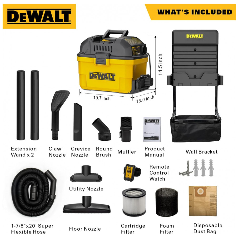 Não perca tempo e adquira o seu hoje mesmo para experimentar a verdadeira limpeza profissional Especificações do produto Marca DEWALT Característica Especial Aspirador de Pó Molhado e Seco com Montagem na Parede Tipo de Filtro Cartucho Componentes Incluídos Aspirador de pó para uso molhado e seco, bocal para piso, abafador, bocal para fendas, suporte para acessórios, mangueira super flexível de 6 metros, escova redonda, manual do produto, bocal utilitário, filtro de cartucho, duas varas de extensão, bocal tipo garra, filtro de espuma, saco de poeira descartável Com Fio Sim Capacidade Aproximadamente 22,7 litros Potência 140 watts Duração de Funcionamento 300 horas Comprimento da Mangueira 6 metros Formato Cilindro Cor Amarelo Preto Nome do Modelo DXV06G Dimensões do Produto 53,34 cm C x 40,64 cm L x 45,72 cm A Nível de Ruído 82 dB Fabricante Alton Industry Quantidade de Itens 1 Tipo de Controle Controle Manual Potência do Motor 5 Cavalos Método de Controle Toque Peso do Item Aproximadamente 9,5 kg Número do Modelo do Item DXV06G Voltagem 110 volts