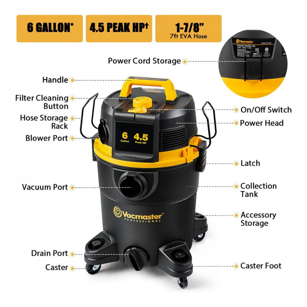 Aspirador de Pó VDK611PF Seco e Úmido 22L, 4.5CV de Potência com Extensores, 110v, VACMASTER, Preto