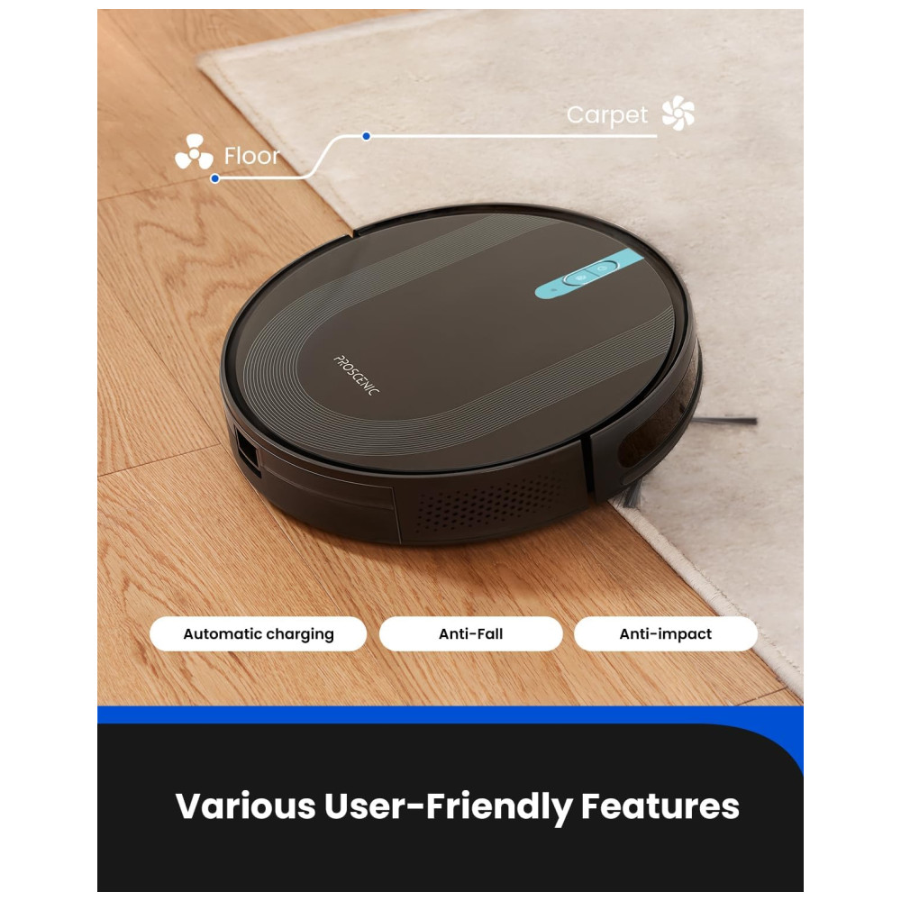 O aspirador robô Proscenic 850T reconhece automaticamente carpetes e muda para o modo de sucção máxima.