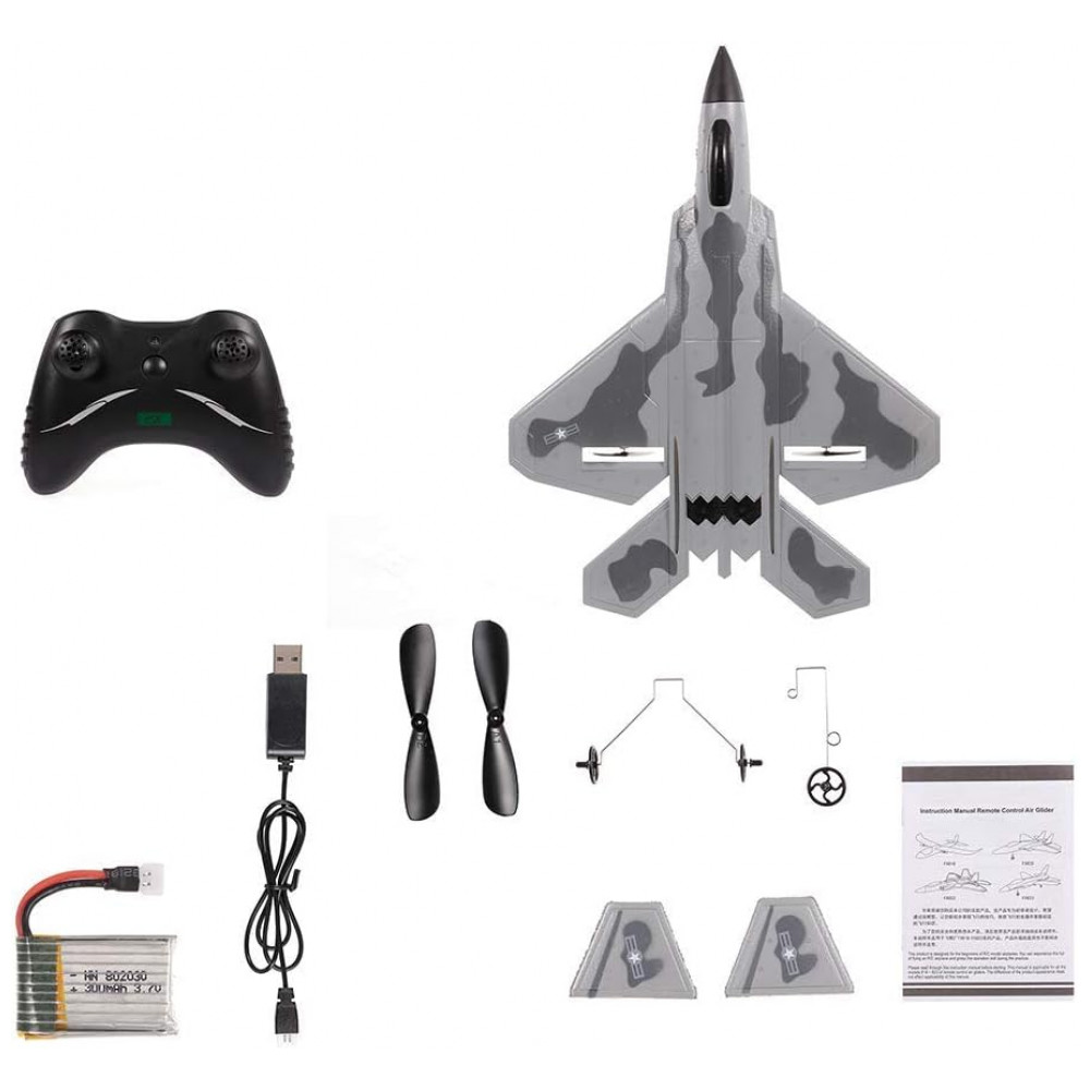 Único avião de asa fixa que é projetado exatamente com base no famoso caça militar F 22 Feito de material anti colisão EPP, leve e de alto desempenho.