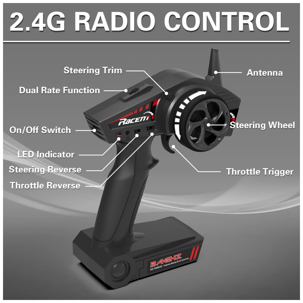 O controlador de rádio de 2,4 GHz com 4 baterias AA permite que vários barcos RC sejam pilotados ao mesmo tempo.