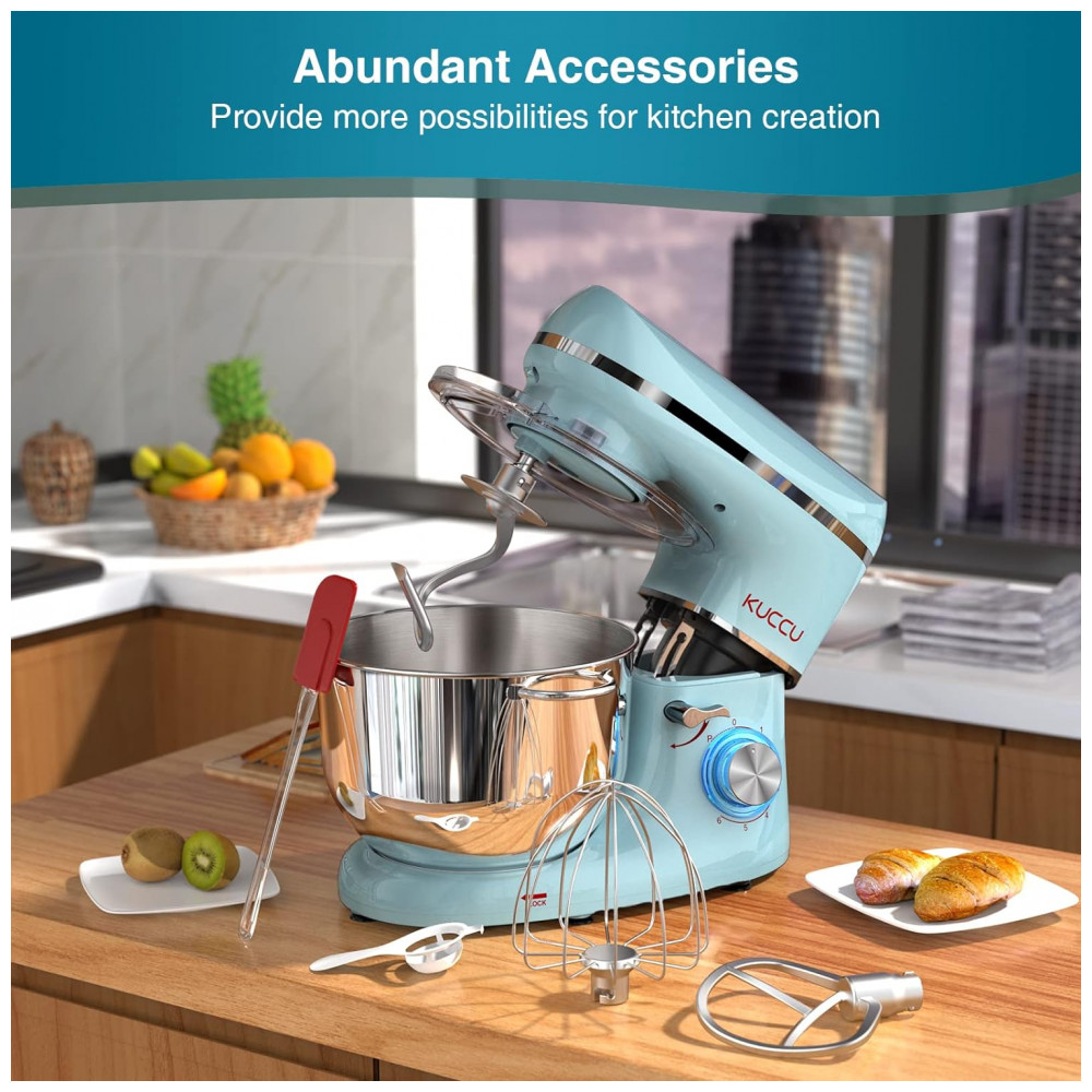 Cada batedeira de cozinha Kuccu vem com um gancho de massa, batedeira, chicote de arame e escudo de despejo evitando o processo de amassar bagunça.