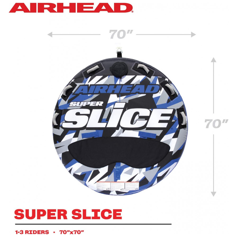 Boia Rebocável Inflável Para 3 Pessoas, Resistente, AIRHEAD, Azul: Apresenta um design de reforço cônico para fornecer melhores características de reboque, uma posição de pilotagem mais confortável e fácil montagem na água A capa de nylon da Super Slice é fabricada com 100 de nylon 840 denier, dando lhe o dobro da resistência de muitas das capas de tubo de deck de nossos concorrentes 6 alças envoltas em nylon e protetores de juntas de neoprene Bexiga de PVC virgem de calibre 30 de 70 esvaziada totalmente revestida por uma capa de nylon com costura dupla com um arnês de reboque reforçado Equipado com um Kwik Connect para fácil fixação em cordas Válvula de segurança de velocidade para inflar e desinflar rapidamente Projetado para 1 a 3 pilotos