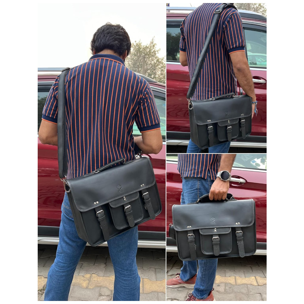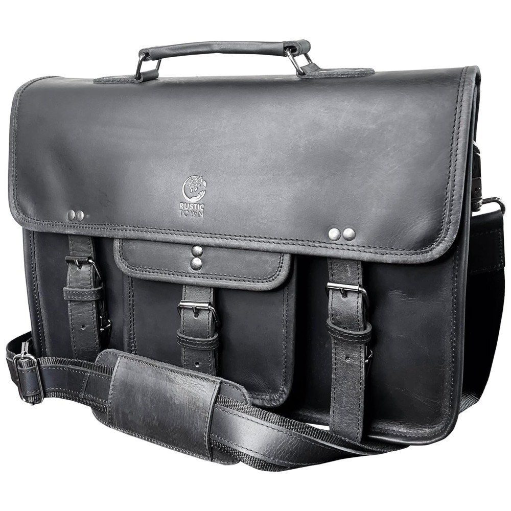 Bolsa Carteiro Masculina Couro de Búfalo para Laptop com 16 Polegadas, RUSTIC TOWN, Preta: Dimensões 40,64 x 27,94 x 10,16 centímetros CxAxL .