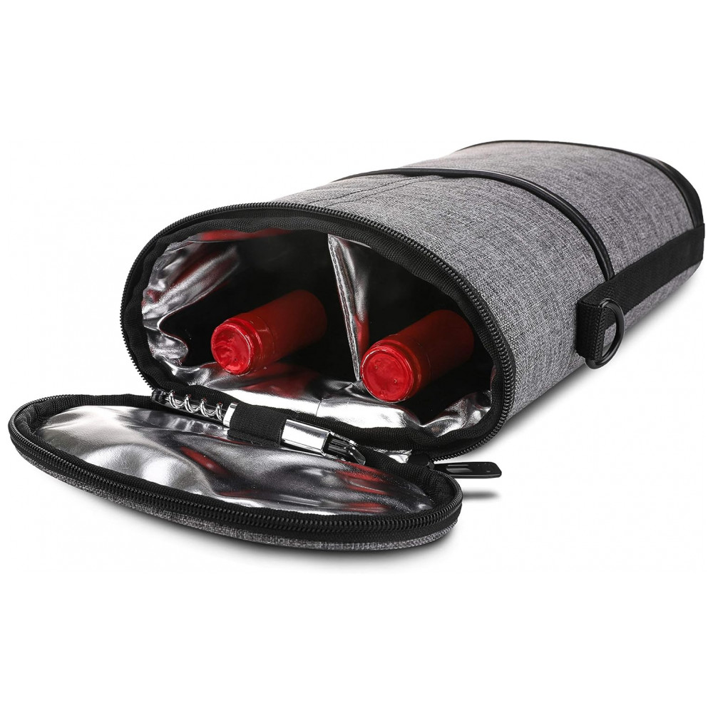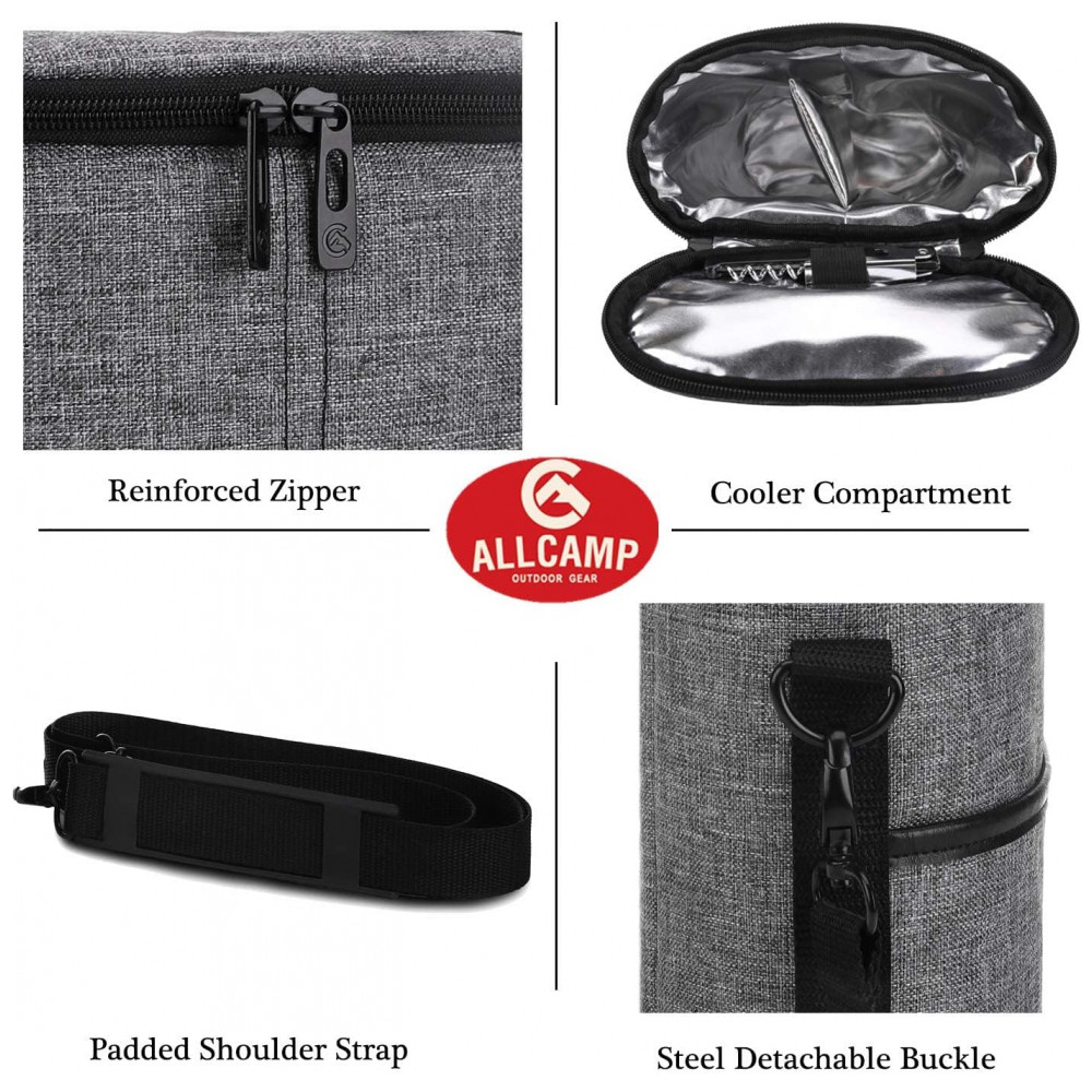 Bolsa Térmica Para Transporte de Vinhos até 2 Garrafas, ALLCAMP OUTDOOR GEAR, Cinza: Tecido Premium O transportador de bolsa de vinho isolado para 2 garrafas da ALLCAMP apresenta poliéster 600D de alta qualidade e materiais isolados de alumínio para garantir durabilidade máxima e estrutura robusta.