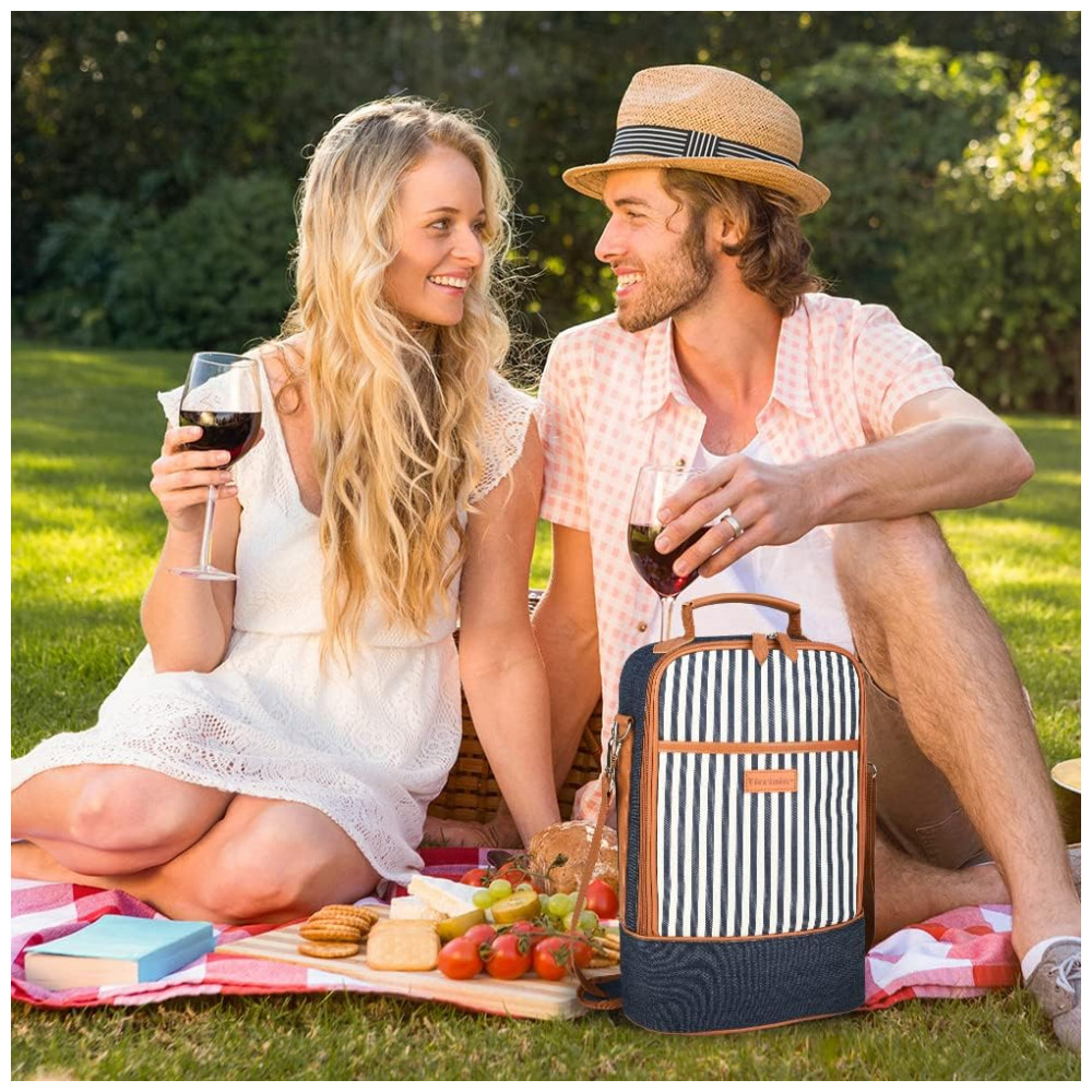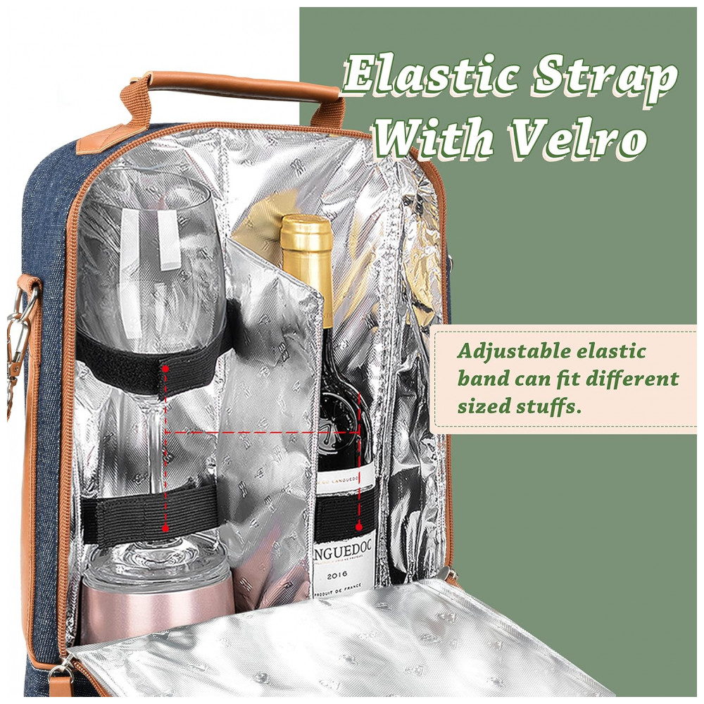 ACOLCHOADO E ISOLADO TÉRMICO Material com isolamento térmico de PU e enchimento de espuma PE de 5mm protegem suas garrafas de vinho de colisões externas, mantenha 2 garrafas de vinho intactas e bem refrigeradas por horas.