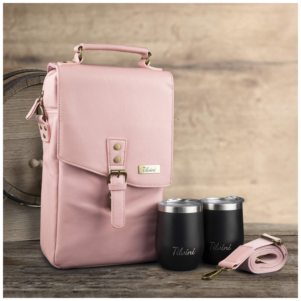 Bolsa Térmica Para Transporte de Vinhos de Couro até 2 Garrafas, com 2 Copos Incluídos, TILVINI TV 01, Rosa: Ótimo presente para mulheres que gostam de acessórios de vinho elegantes.