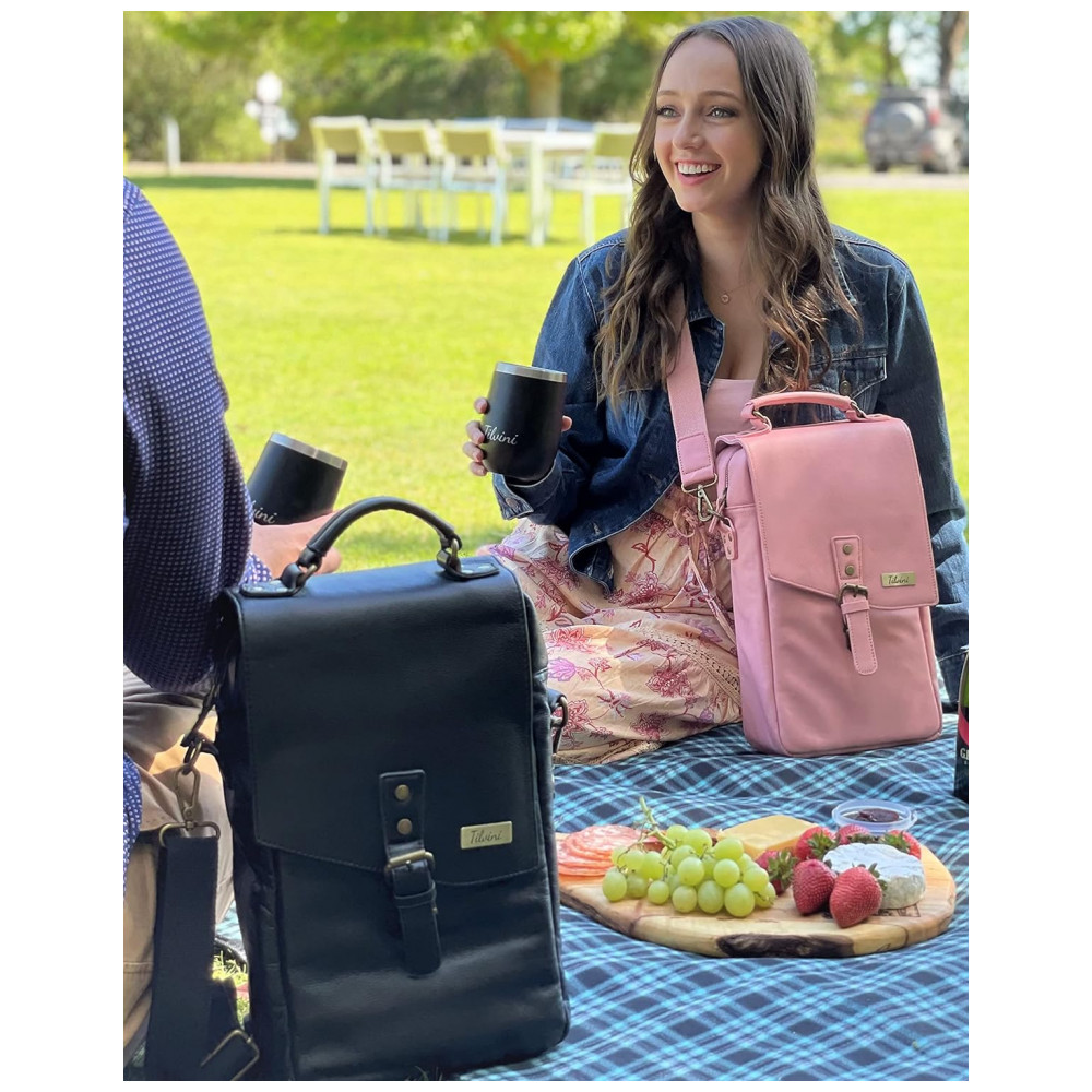 A bolsa de couro para vinho Tilvini carrega 2 garrafas de vinho e copos de vinho e é isolada, criando o conjunto perfeito para presente de piquenique.