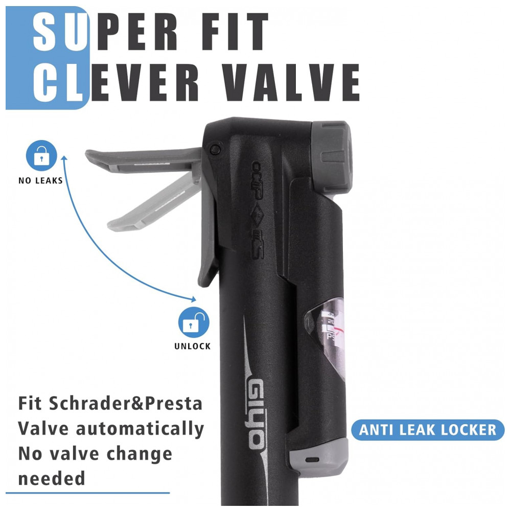 Bomba de Piso Ergonômica para Bicicleta com Medidor e Válvula Inteligente 120 PSI, GIYO, Preto: Sistema de válvula inteligente A bomba de bicicleta de mão combina com a válvula compatível automaticamente para válvulas Scharder e Presta.