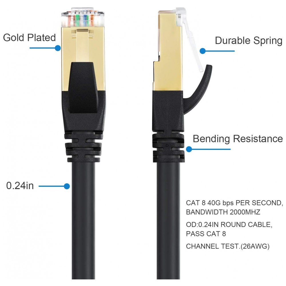F , FTP Velocidade O cabo Ethernet Cat8 é feito de 4 pares blindados F , FTP e fios OFC de fio único 26AWG que suporta largura de banda de até 2.