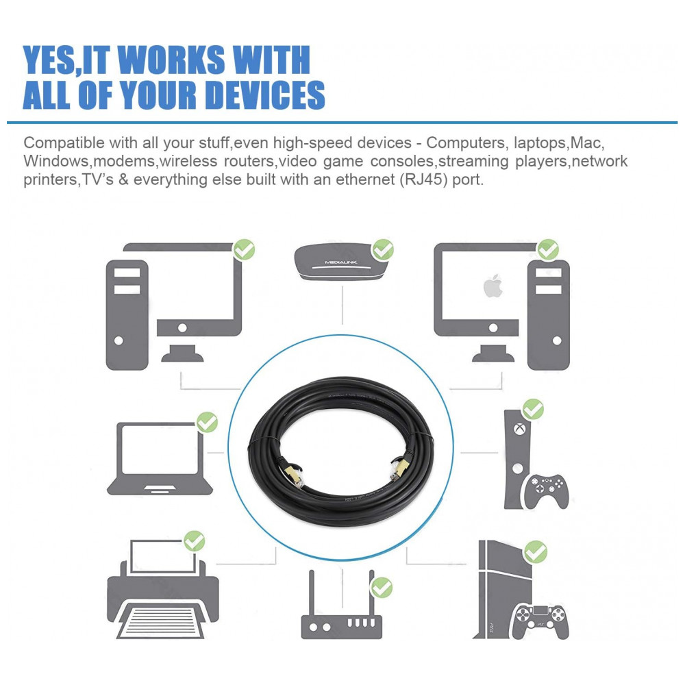 Conectores RJ45 e RJ45 com dois conectores RJ45 blindados em ambas as definições, cabo Ethernet Cat8 funciona com switch de rede ampla, ADSL, modem, PS3, PS4, X box, painel de patch, impressoras de rede, Netgear, TP link, NAS, telefones, VoIP, notebook, IP Cam, roteadores, switch Nintendo, Servidores, Coupler Hubs, Jack Keystone, Smart TV, Imac e outros dispositivos com conectores RJ45.