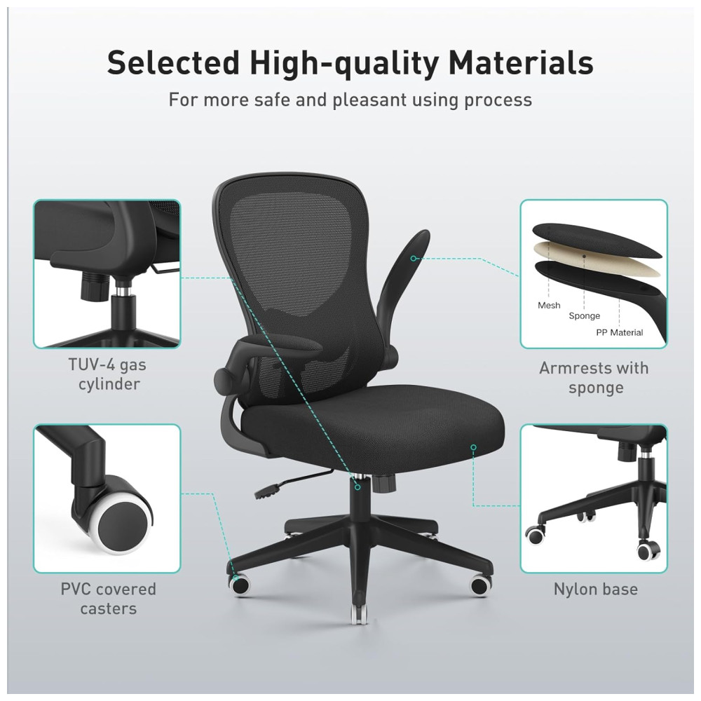 Simples e elegante design elegante e cadeira de mesa de ajuste simples com encosto médio Combine diferentes estilos decorativos Braços articulados braços articulados que economizam espaço para diferentes situações Quando estiver vazio você pode colocá lo sob sua mesa Altura ajustável a altura da cadeira é ajustável você pode ajustá la para a altura de sua preferência e aperfeiçoar a posição sentada Alavanca de inclinação Empurre para travar na posição vertical puxe para ativar o movimento de balanço Estável e durável Base de alta capacidade de carga com rodas de rolamento suaves e silenciosas, capacidade máxima de 113 kg Também pode ser no quarto