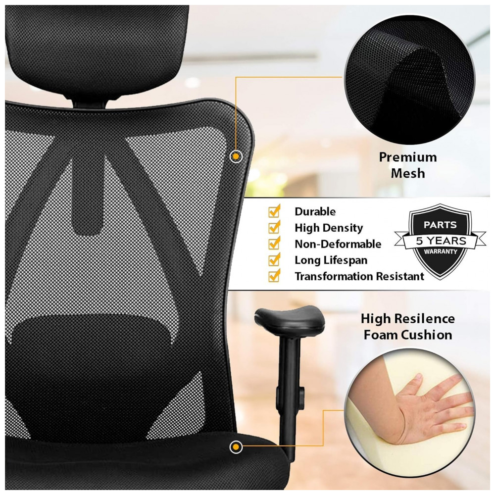 Cadeira de Escritório Ergonômica Giratória com Apoio de Braços, Suporte Lombar Ajustável e Apoio de Cabeça, DURAMONT DDC312, Preto