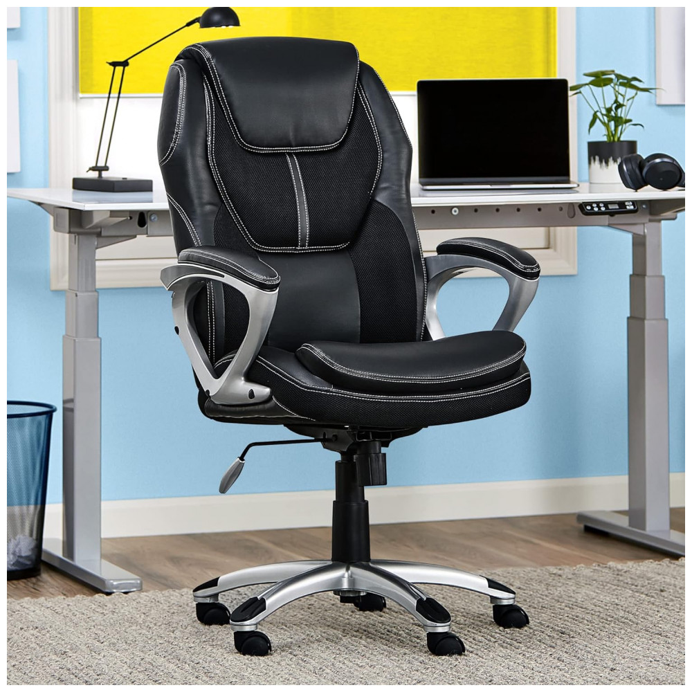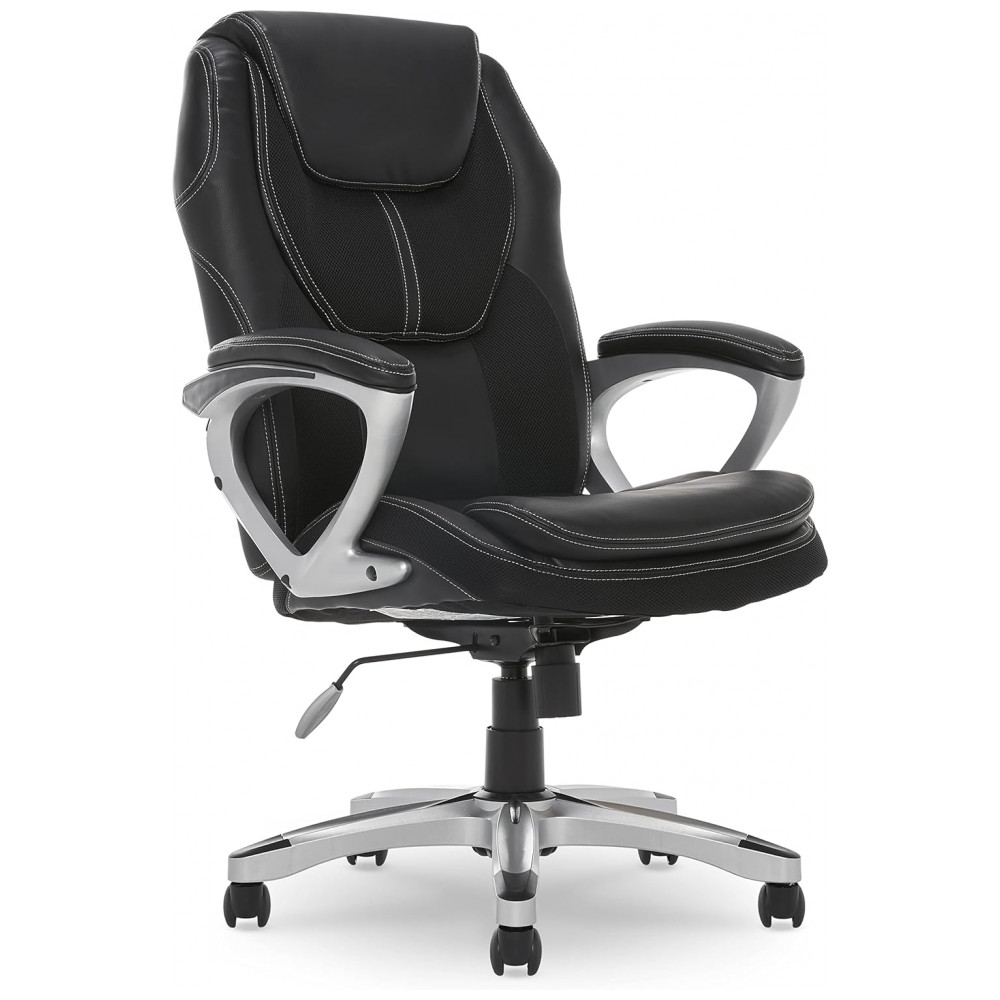 Cadeira de Escritório Executivo Ergonômica Giratória com Suporte Lombar e Altura Ajustáveis, SERTA 43673, Preto: O CONFORTO ENCONTRA A PRECISÃO Cadeira de escritório elegante projetada com jogadores e programadores em mente ASSENTO ERGONÔMICO E SUPORTE LOMBAR Personalizado para ajudar a reduzir o estresse nas costas, pescoço e ombros DESIGN INSPIRADO EM CARRO DE CORRIDA Estofos em couro com detalhes em malha respirável ÓTIMO PARA TRABALHAR OU JOGAR Ajuda a mantê lo confortável e relaxado, esteja você trabalhando ou relaxando VERSÁTIL E MÓVEL configurações de altura ajustáveis, design giratório conveniente e rodízios rolantes