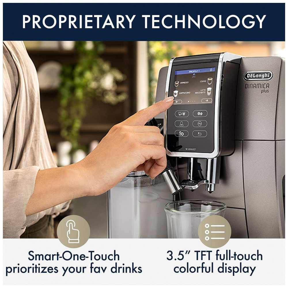 Componentes incluídos Máquina de café expresso totalmente automática De Longhi Dinamica Plus, filtro de carbono ativo, colher de medição, teste de dureza total, escova de limpeza, descalcificador 100mL, bico de água removível, jarro de leite
