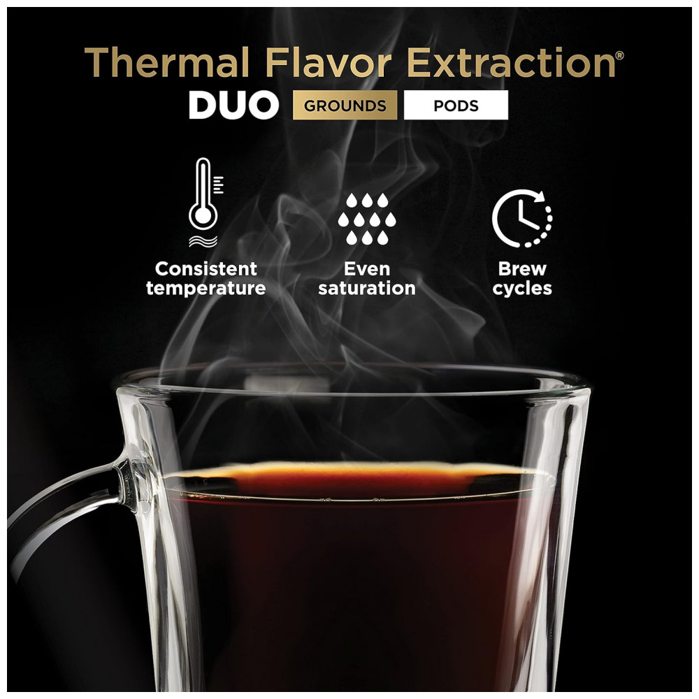 Extração Térmica Duo de Sabor A tecnologia de preparo inteligente oferece preparos rápidos e suaves de café ultra saboroso, tanto de café moído quanto de cápsulas, através de temperatura consistente, saturação uniforme do café moído e padrões de preparo e pausa.
