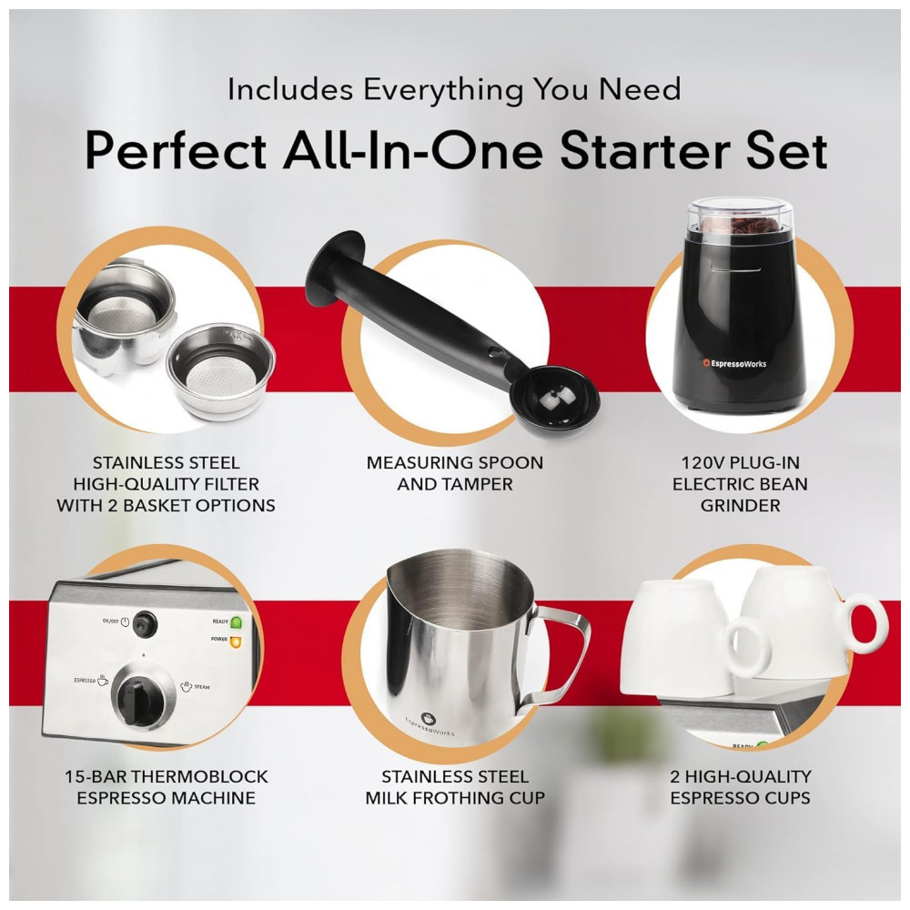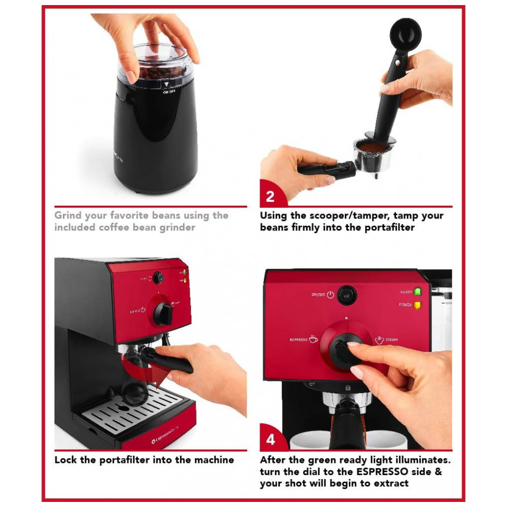 Inclui Máquina de café expresso e cappuccino com bomba de 15 bar, moedor elétrico de grãos de café, porta filtro de aço inoxidável com cestos de filtro de dose única e dupla, jarra de espuma de leite, colher, tamper, 2 xícaras de café expresso de cerâmica MÁQUINA DE ESPRESSO e LATTE MAKER 15 BAR PUMP PRESSURE SYSTEM Faça um excelente café expresso em casa, Americano em casa e Macchiato em casa sem ir ao café UM TIRO ÚNICO E UM TIRO DUPLO DE EXPRESSO Inclui um filtro de aço inoxidável de dose única e dupla para escolher o tamanho da sua dose de café expresso.
