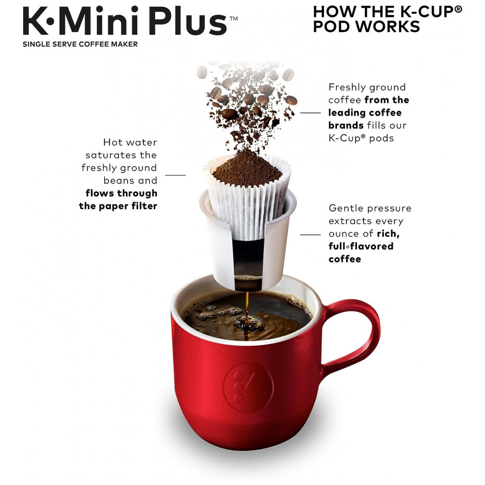 A cafeteira K Mini Plus é fácil de usar sem esforço basta adicionar água fresca ao reservatório removível, colocar sua cápsula K Cup favorita, pressionar o botão de infusão e desfrutar de um café fresco e delicioso em poucos minutos.