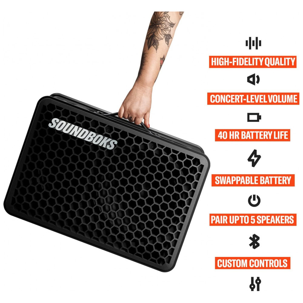 Caixa de Som Bluetooth Portatil SOUNDBOKS Go com 40H de Reprodução e Subwoofer, SB, Preto: SOM PODEROSO DE 126 dB, LÍDER DA INDÚSTRIA Experimente um GRANDE som de nível de concerto com a tecnologia patenteada de amplificador multipasso Eximo para clareza líder da indústria e eficiência energética durante todo o dia.