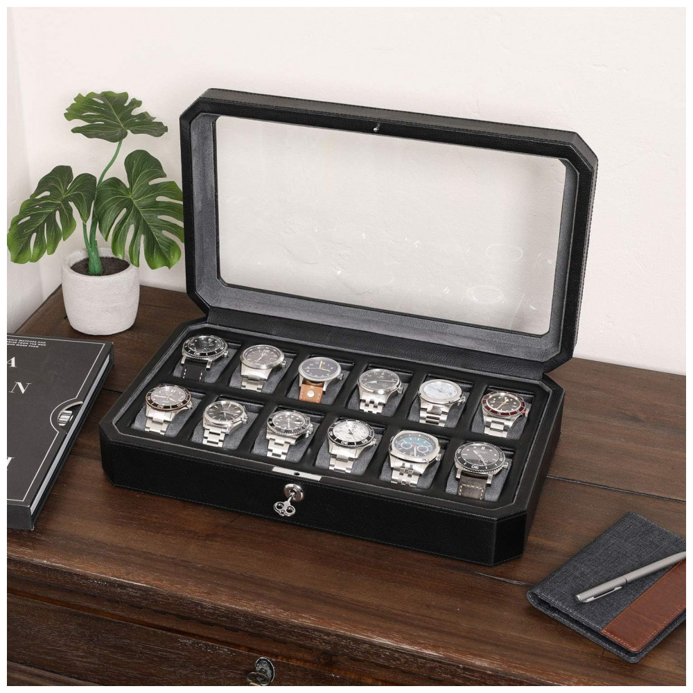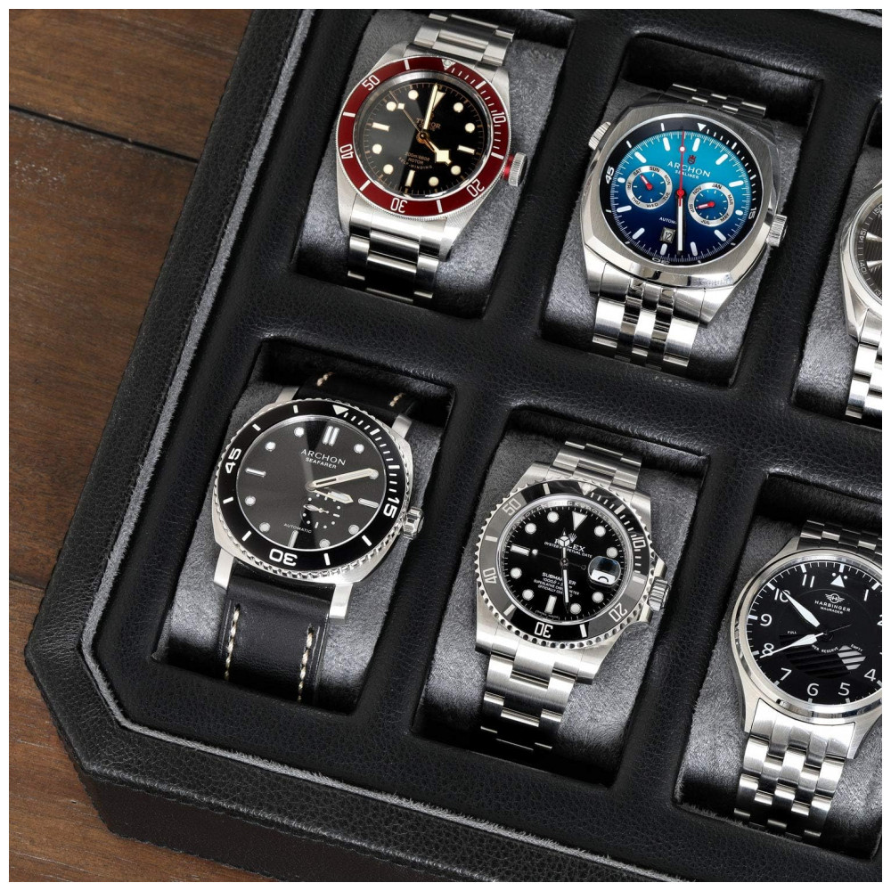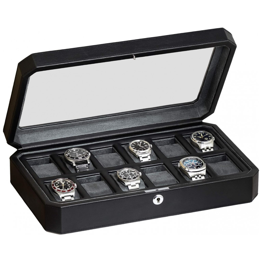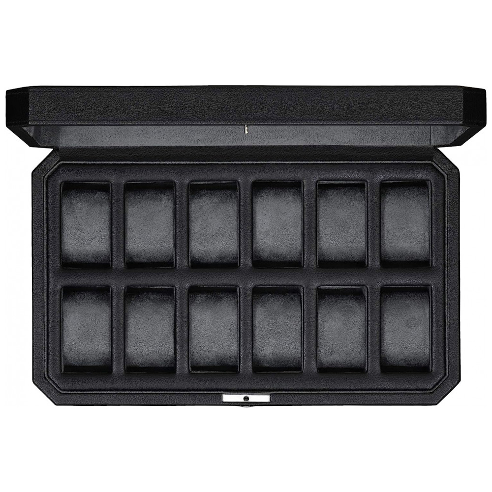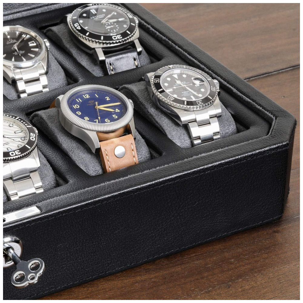 Caixa, Estojo para Relógios Protege e zena, 12 Lugares, ROTHWELL, Preto: 12 COMPARTIMENTOS GRANDES PARA RELÓGIOS Cada almofada mantém um relógio pequeno ou grande perfeitamente no lugar, até um ao lado do outro.