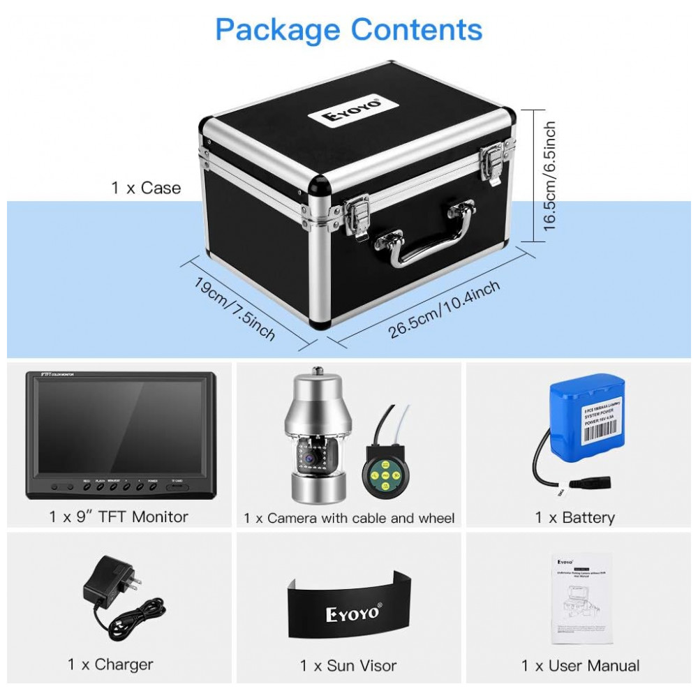 Câmera de Pesca Subaquática Portátil à Prova d com Monitor e Luzes Infravermelhas, Cabo 30 M, EYOYO, Preto