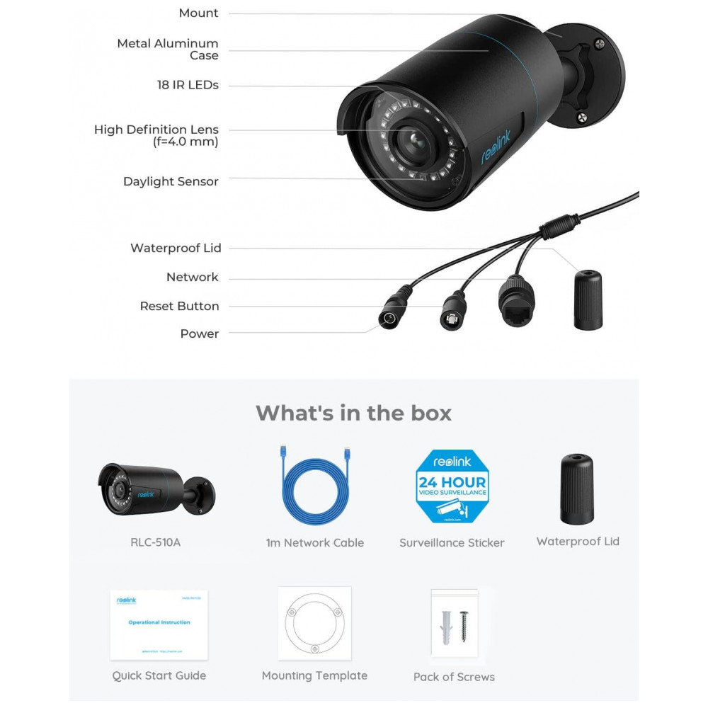 Câmera de Segurança Inteligente 5MP PoE IP, REOLINK RLC 510A Black, Preto: