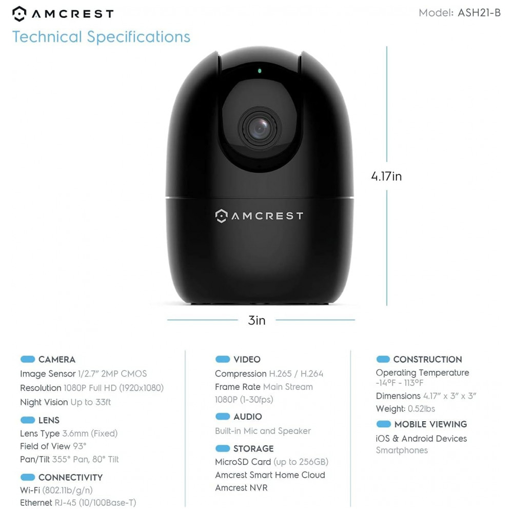 Câmera de Segurança Interna 1080P Wi Fi Detecta Movimento, 2 Saídas de Audio, AMCREST ASH21 B, Preto: CÂMERA, ZOOM e WIFI Transmissão ao vivo de 1080p a 30 FPS de vídeo e áudio bidirecional.