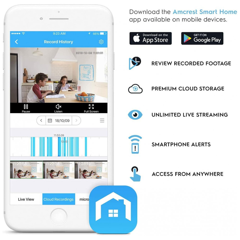 zene suas imagens remotamente na Amcrest Smart Home Cloud ou localmente em um cartão MicroSD classe 10 de até 256 GB.