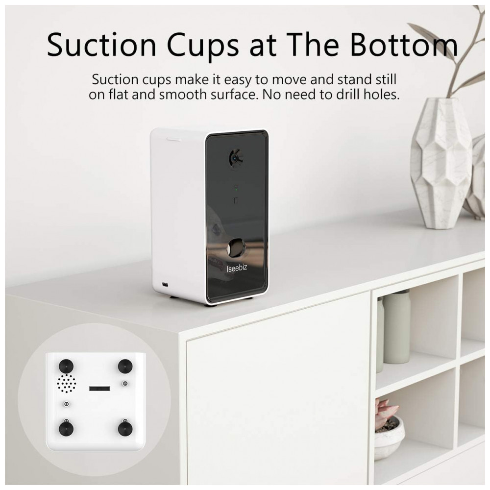 Câmera Inteligente com Dispensador de Petiscos para Cães Controle de Voz 1080P, ISEEBIZ T980, Preto: Arremesso de guloseimas divertidas e convenientes Jogue uma guloseima para seu cão ou gato remotamente por meio do aplicativo gratuito Iseefeeder no Google Play e Apple App Store onde quer que esteja, sempre que quiser.