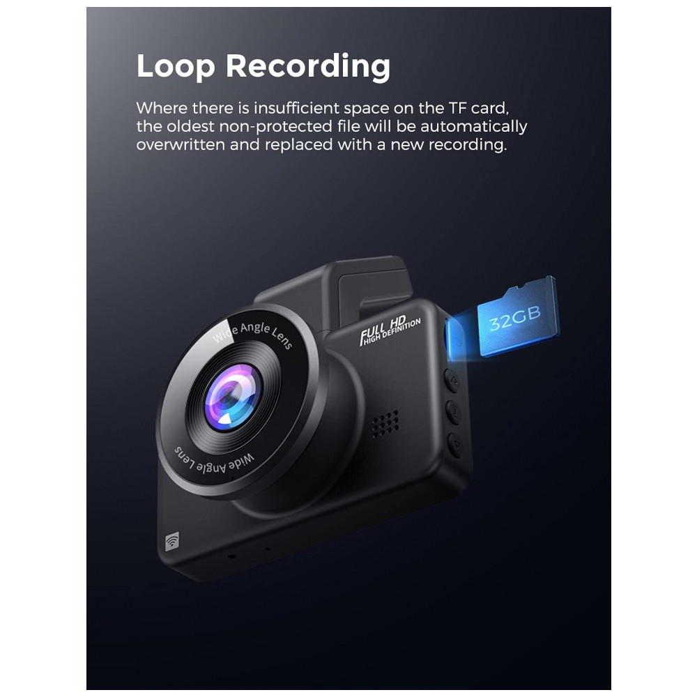 Gravação Seamless Loop Usando a tecnologia de cobertura contínua, este gravador de direção de carro garante uma gravação ininterrupta e quando o cartão está cheio, os arquivos mais antigos são substituídos por s vídeos.