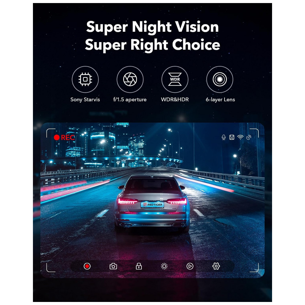 Câmera Real Ultra HD 4K 1080P Dual Dash A câmera REDTIGER F7N oferece 4K 3840 2160P de alta qualidade com sensor Sony IMX415 na câmera frontal e 1920 1080P na câmera traseira que captura uma visão super nítida.