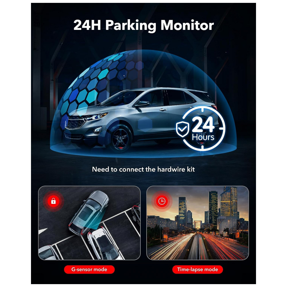 Monitoramento de estacionamento 24 horas , Sensor G , Gravação de loop Com o kit de hardware dedicado, o gravador pode monitorar automaticamente o ambiente circundante.