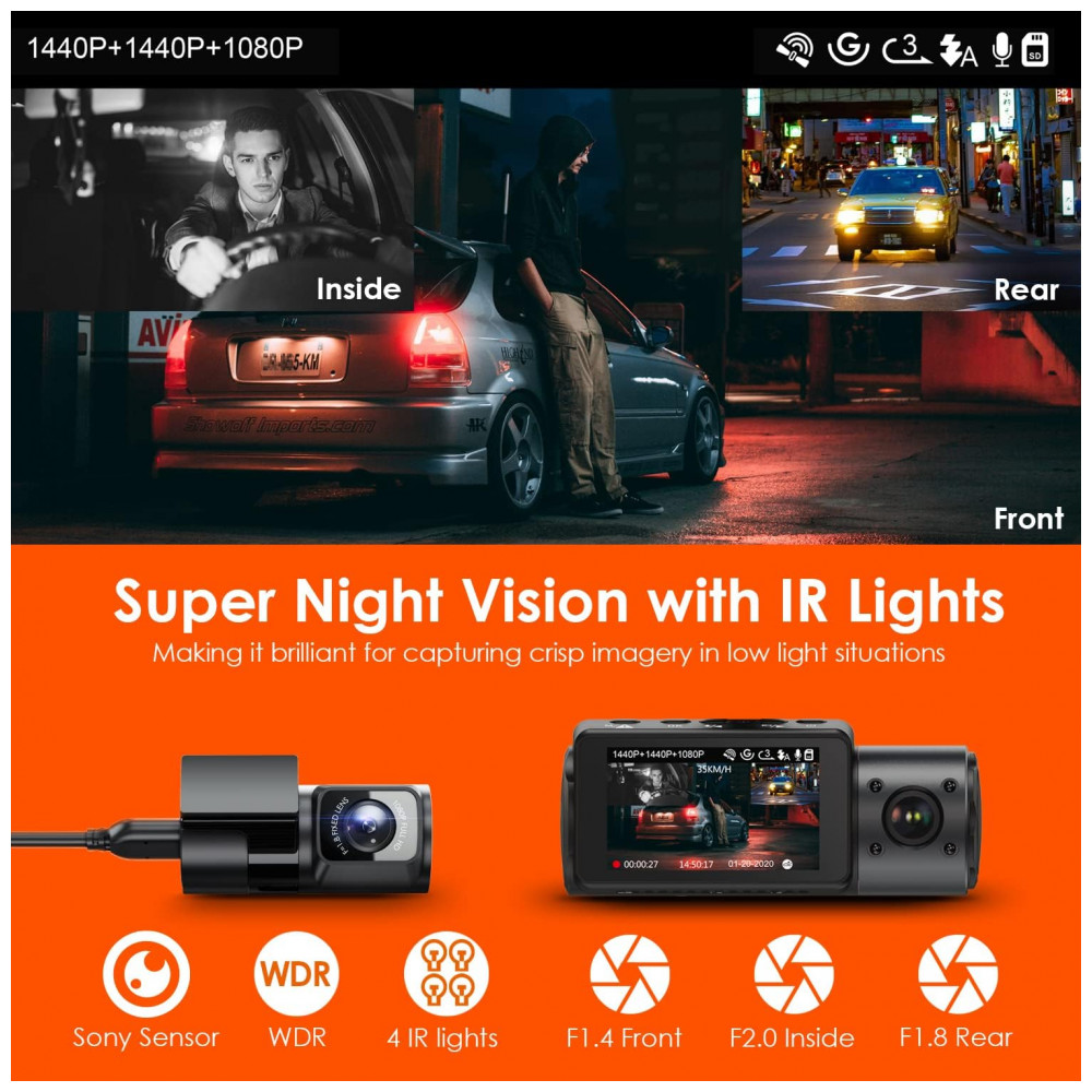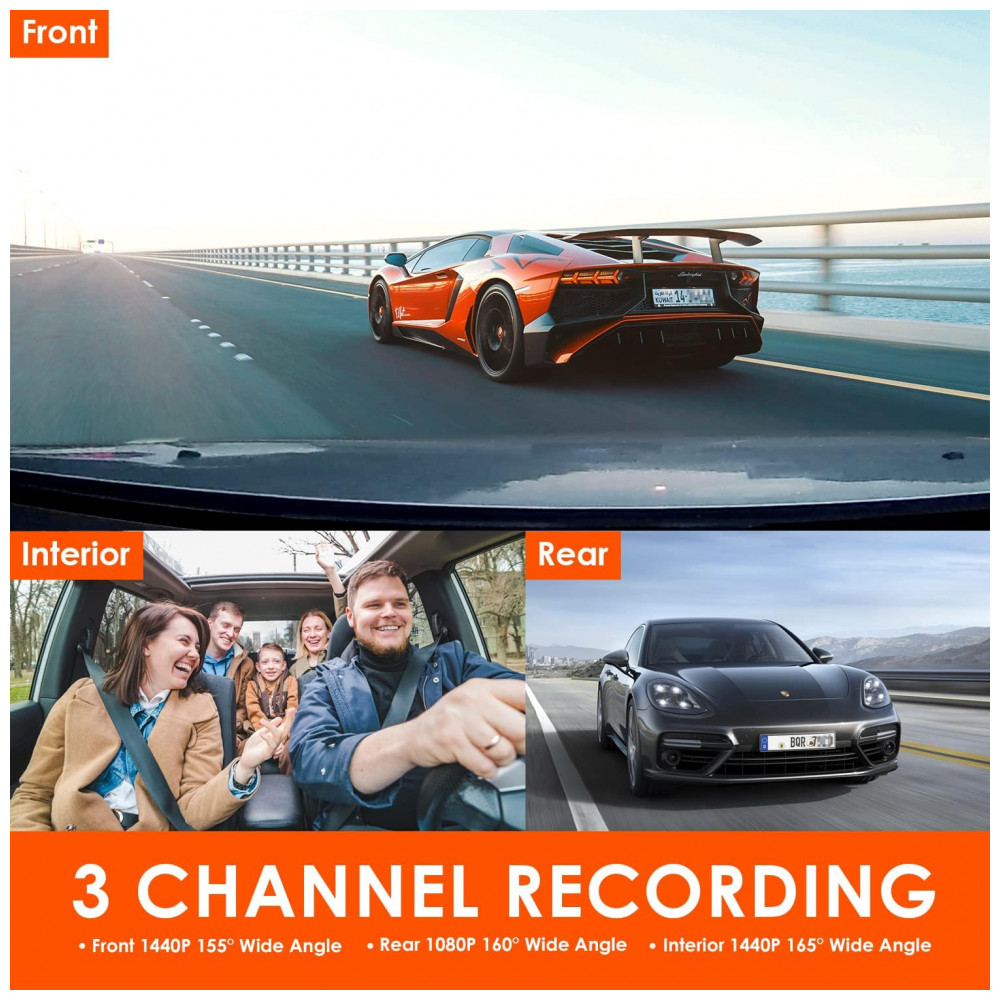 canais Dash A N4 oferece três câmeras frontal de 155, câmera interna de 165 e câmera traseira de 160 para a frente, cabine interna e traseira da estrada simultaneamente a 1440P 108…