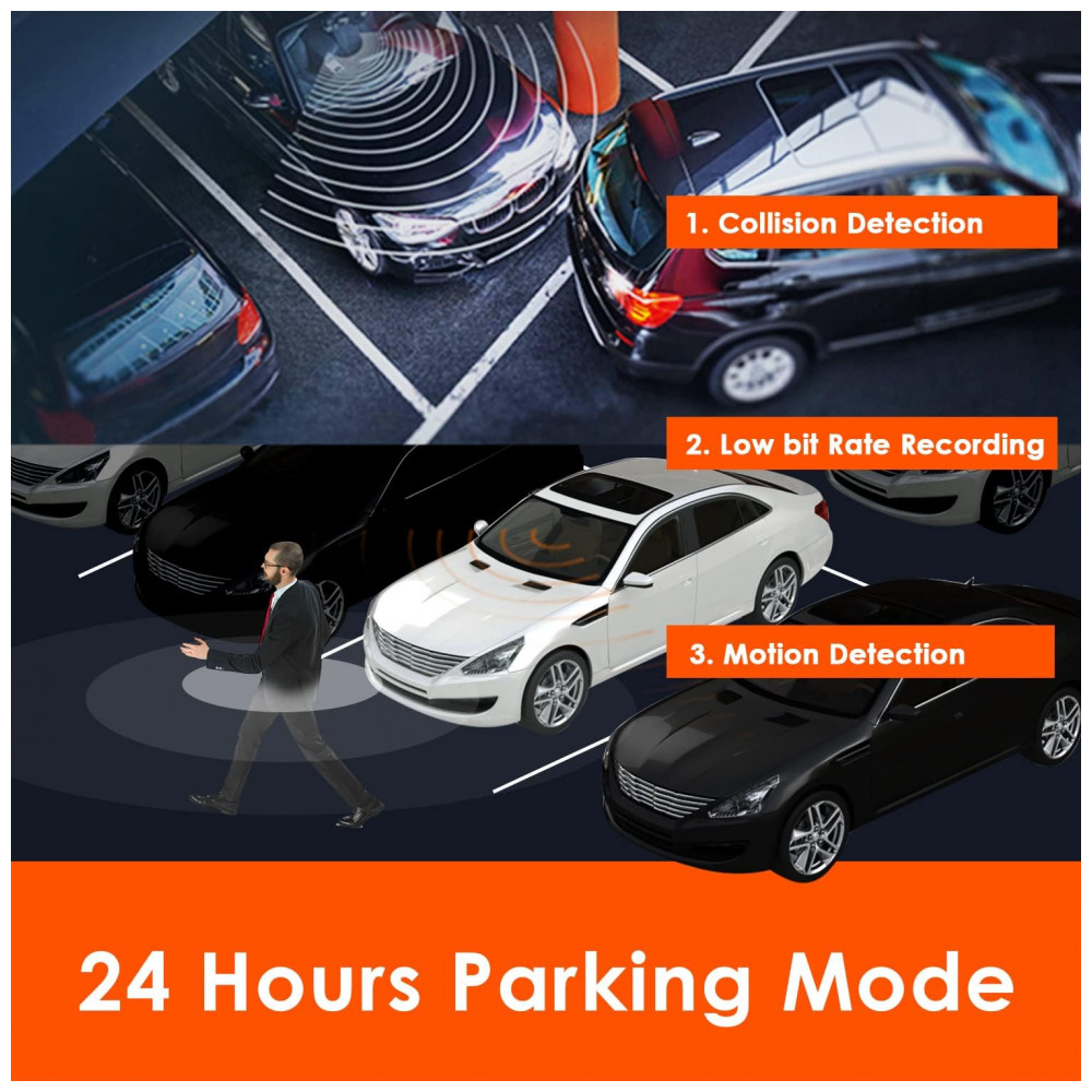 Monitoramento de estacionamento 24 horas Com o kit de cabeamento, a câmera do painel muda automaticamente 5 minutos para o modo de estacionamento depois de estacionar o carro.